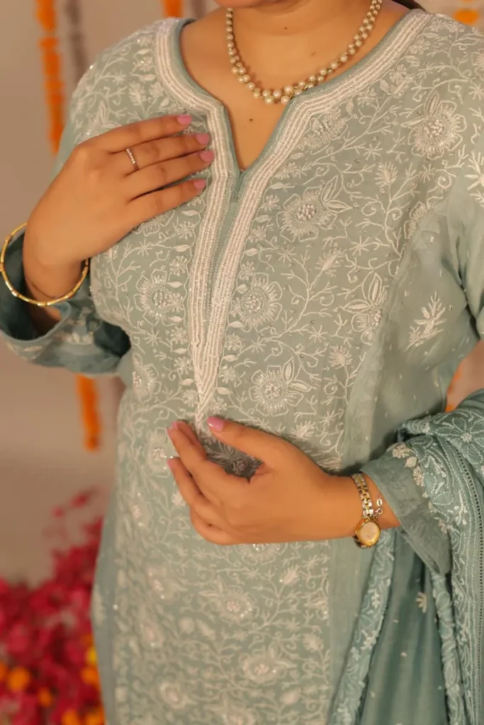 Most exclusive hand-embroidered designer wear by Manju Jalota. Explore our latest collection of Chikankari Sarees & Suits.