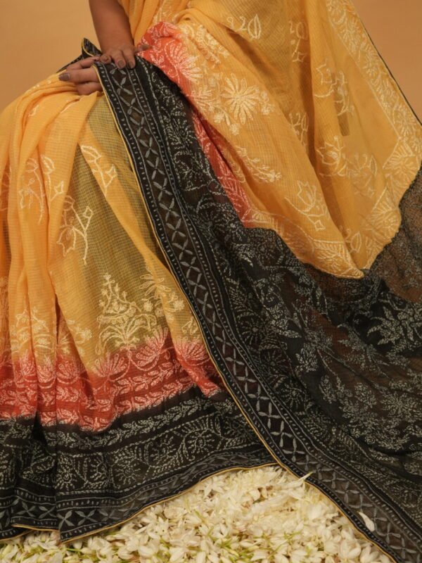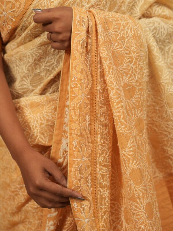 Mustard Yellow kota chikankari saree with tapechi and applique woork