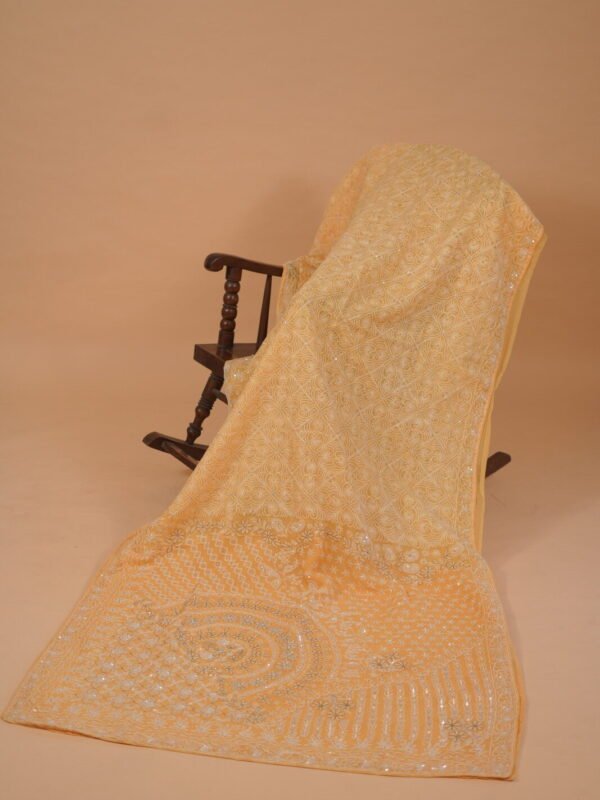 Yellow silk organza saree for party wear. Embellished with Zardozi and cutdana