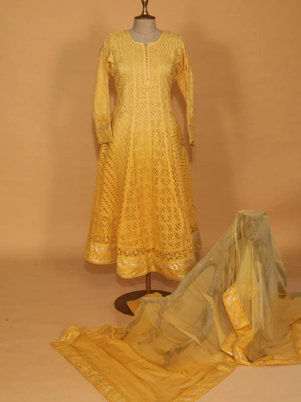 Yellow Voil Anarkali Full Flared 3 Pc Set with Elegant Embroidery