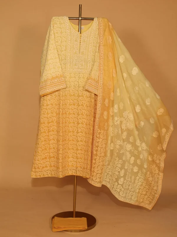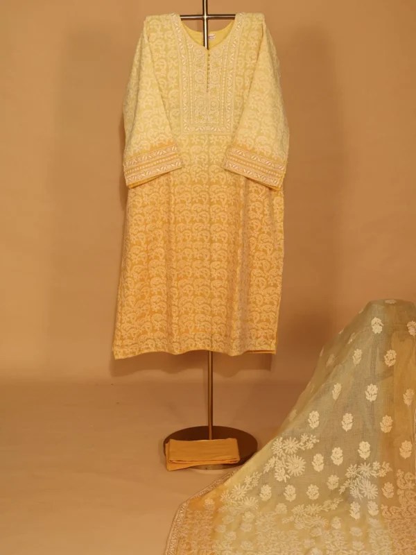 Lime Yellow Chanderi Silk Chikankari Suit Set with Sequins Work – 3 Pc