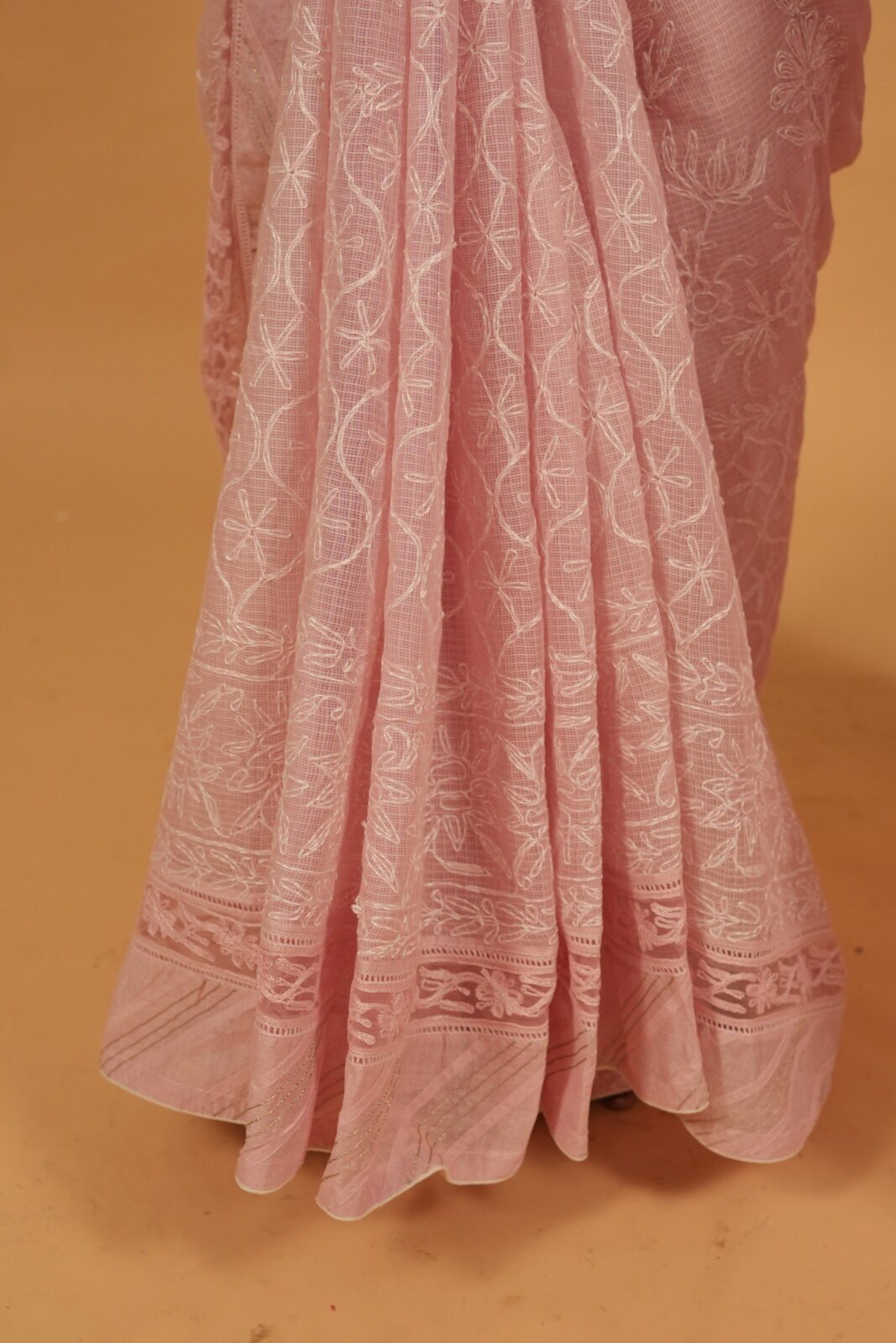 Baby Pink kota embroidered saree. The saree comes with pintucks border. It has got all over tapechi embroidey and cutwork border.