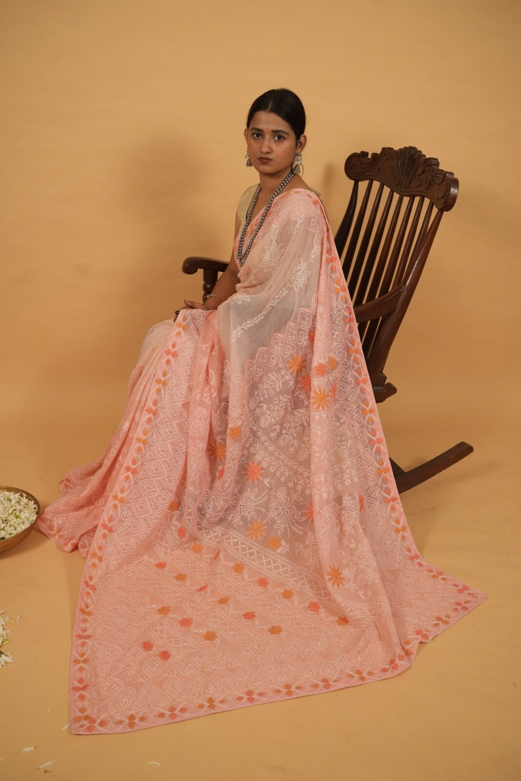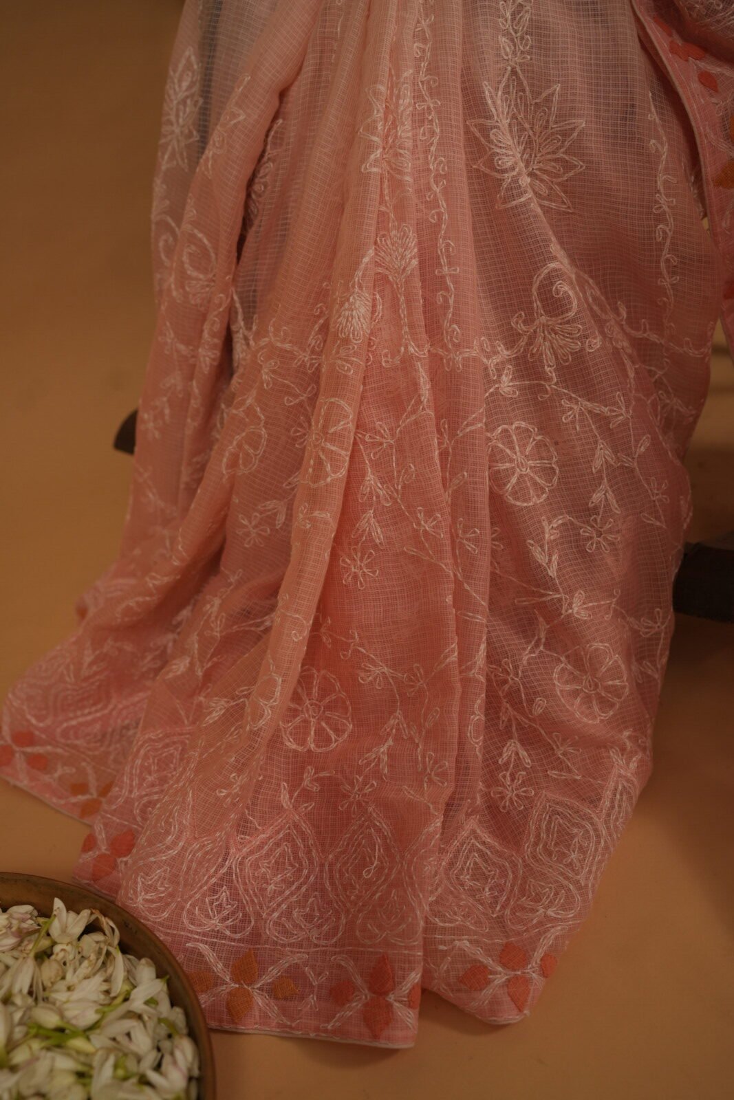 Baby pink kota saree applique work on pallua nd border. Tapechi embroidery all over matched with multicolor applique work. The saree has got 1.5 Metre blouse with lining.
