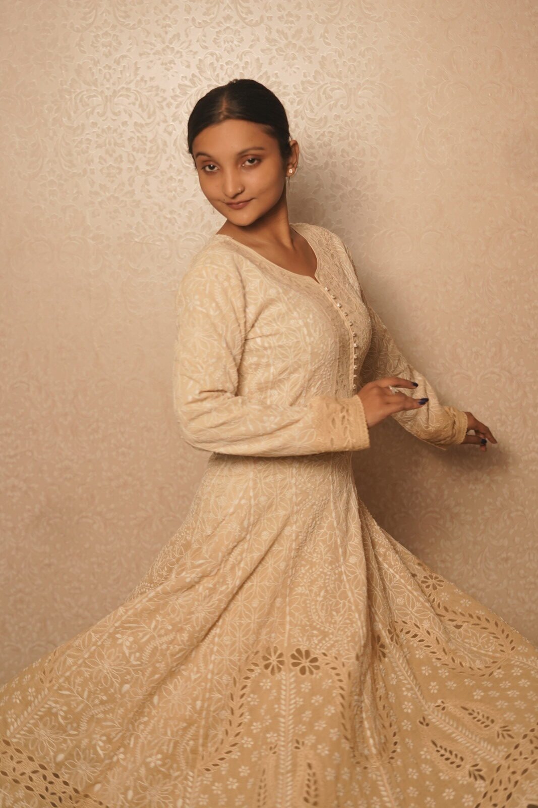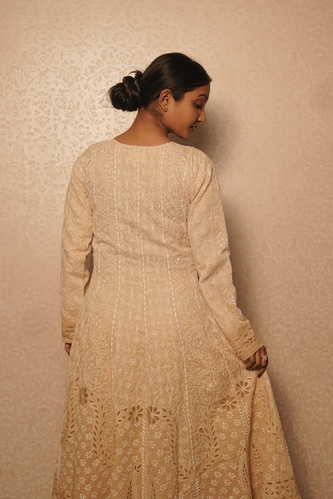 Beige cotton Anarkali with full flared silhouette and intricate embroidery. Elegant, breathable and perfect for festive occasions and timeless ethnic wear.