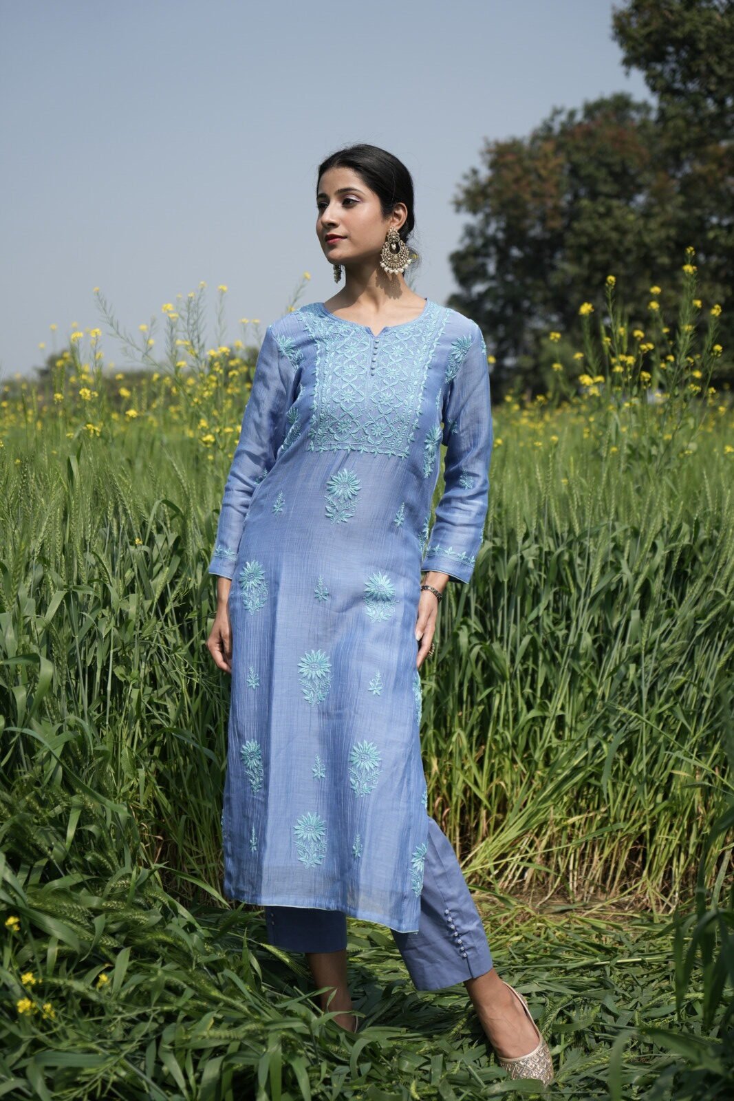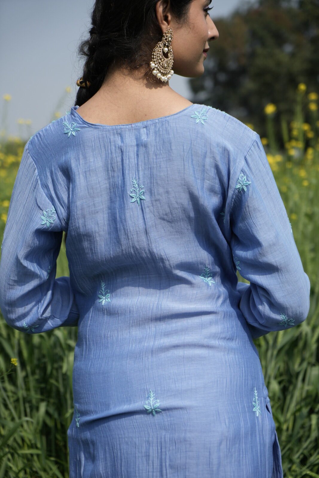 Classic blue chikankari suit set featuring delicate hand embroidery and beadwork for a refined and sophisticated ethnic outfit.