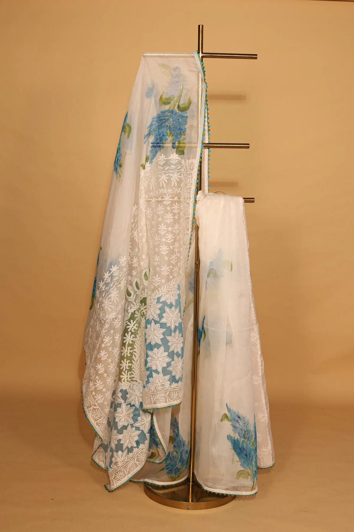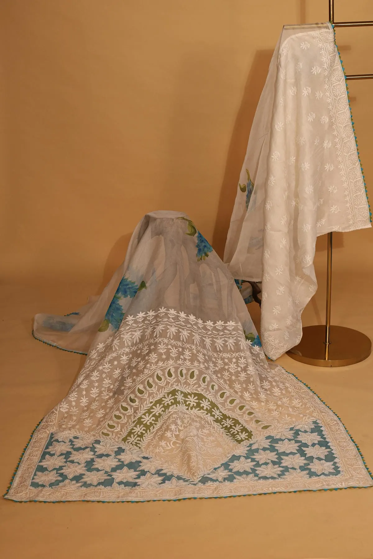 Tags: Blue handpainted saree, Festive embroidered saree, Party Wear Silk Saree, Silk organza chikankari saree, Wedding ethnic saree