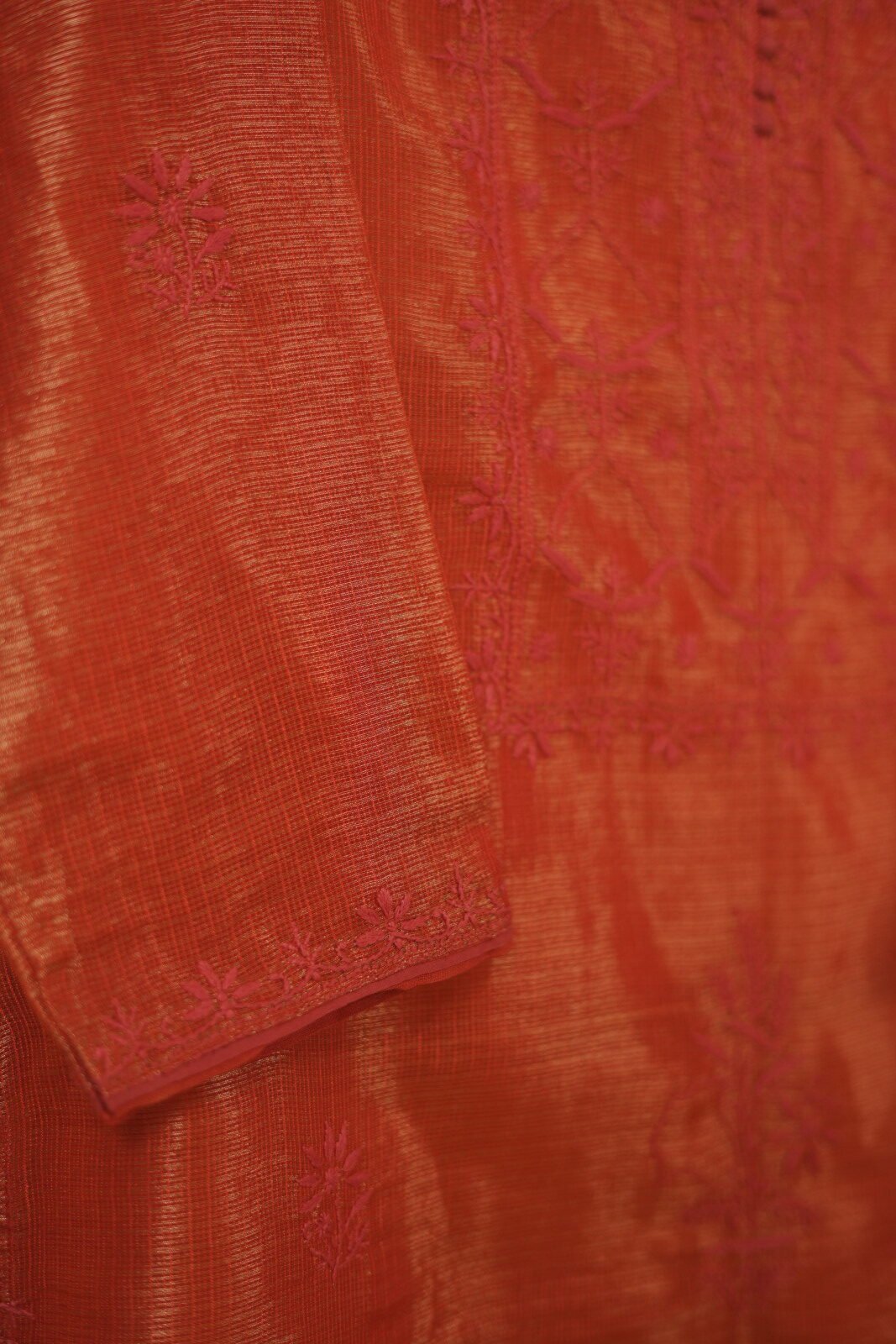 Red colored salwar suit set in Tissue fabric. It has handmade embroidery work done all ober. It comes with bottom, lining and dupatta attached to it.