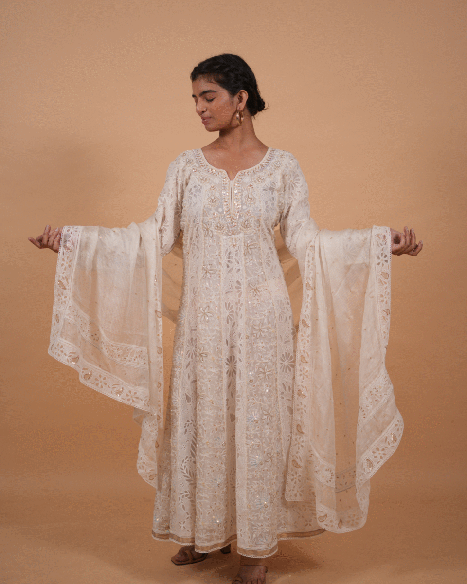 Cream Kota Anarkali in handmade Chikankari with multi color piping