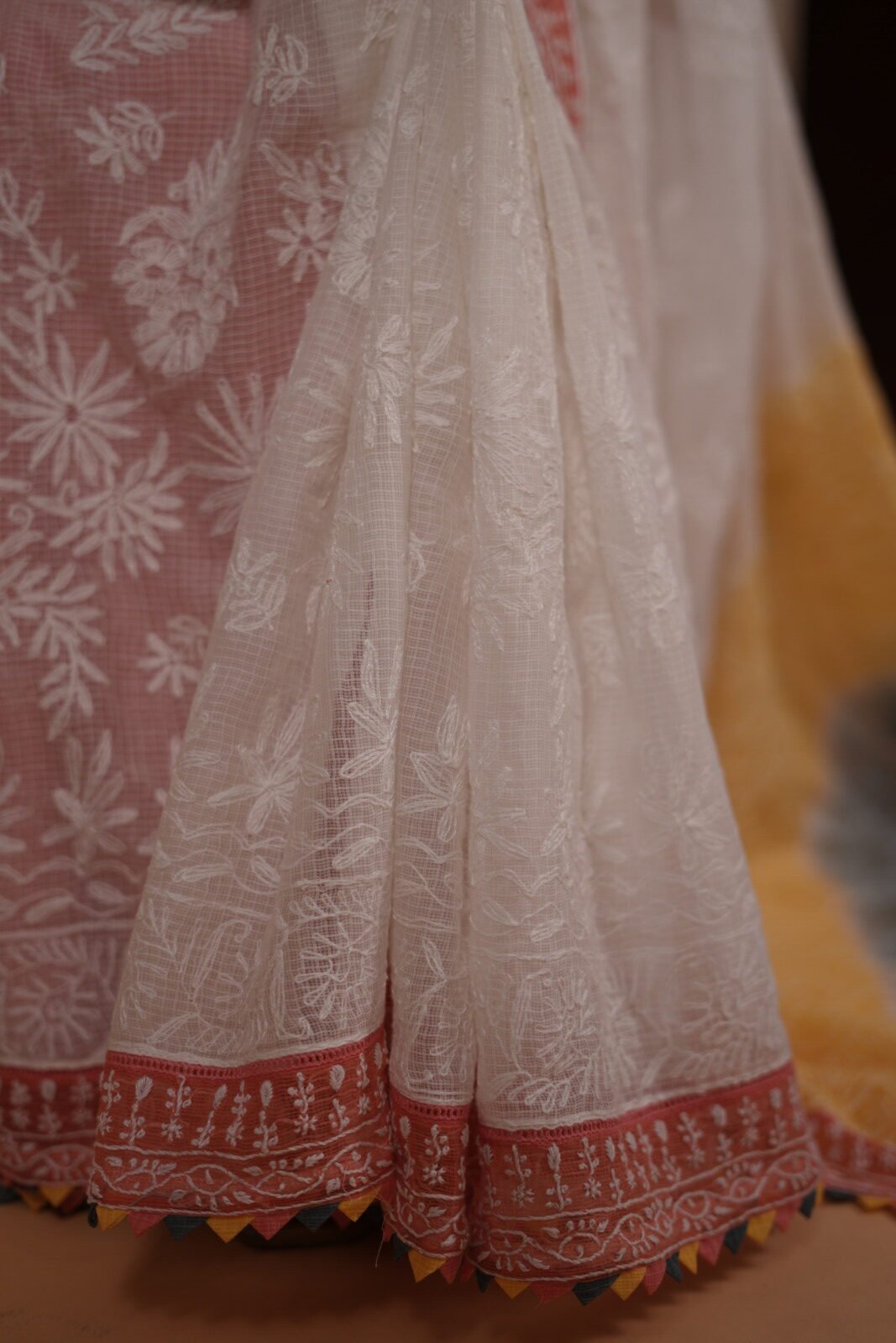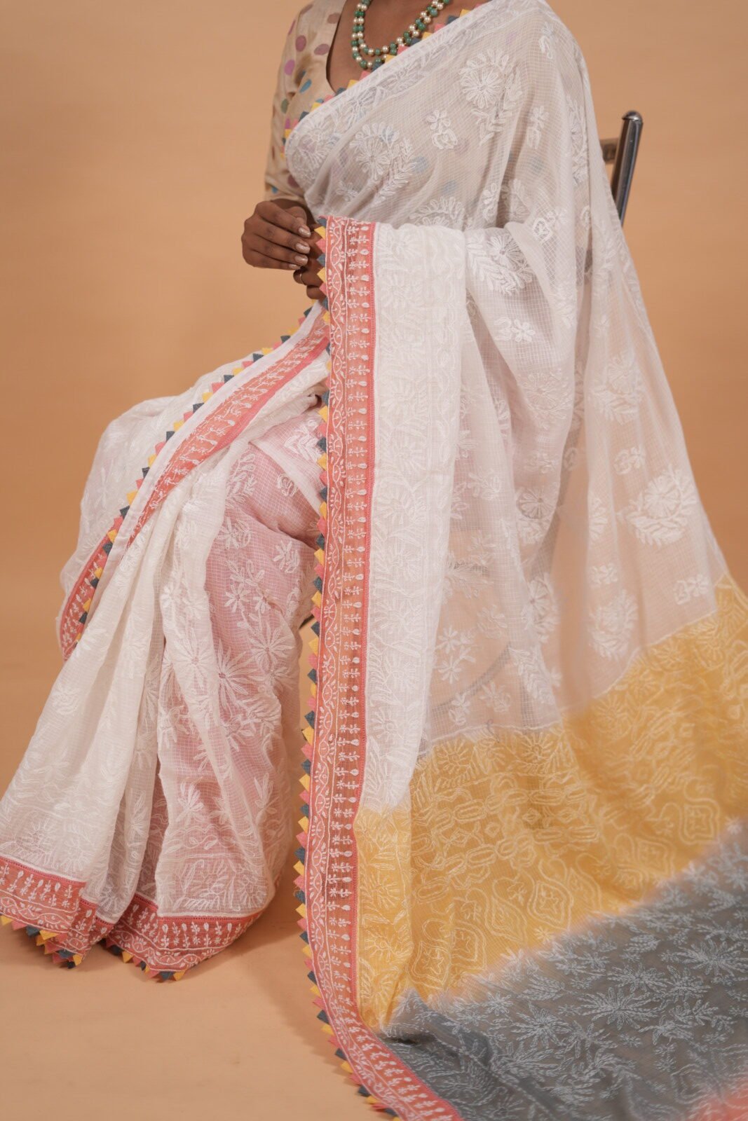 Cream color tapechi kota saree with multicolored pallu. It has a grey, coral & lemon colored shaded pallu . It is finished with multicolored scalopes. It comes with a 1 metre blouse and lining.