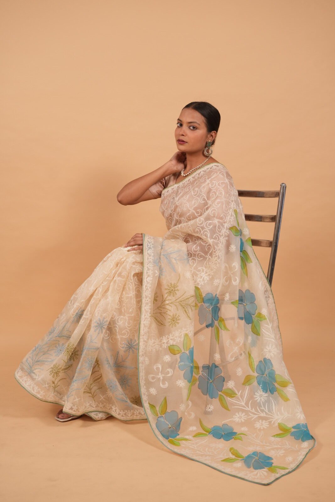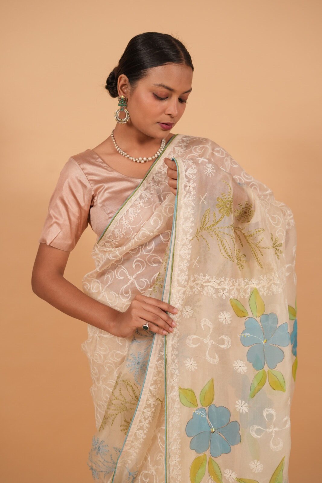 Cream Colored Silk Organza Saree having multicolored tapechi embroidery and a delicate hand painted pallu. It comes with a 1 metre blouse with lining.