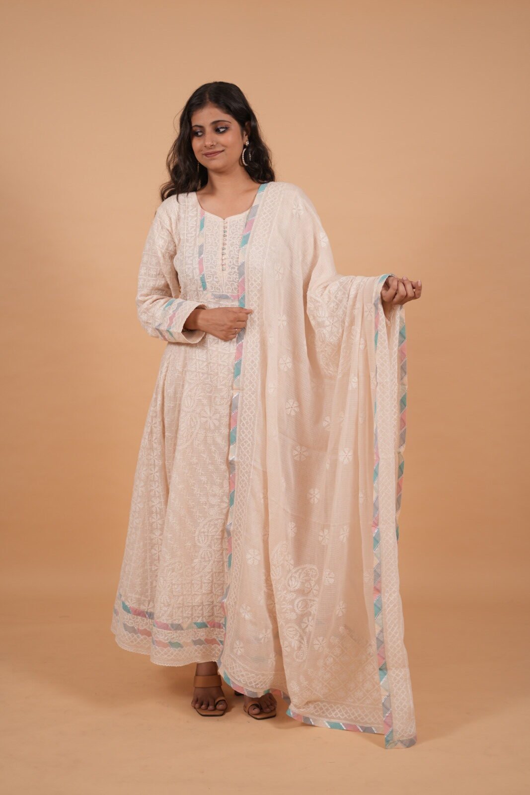 Cream Kota Anarkali in handmade Chikankari with multi color piping