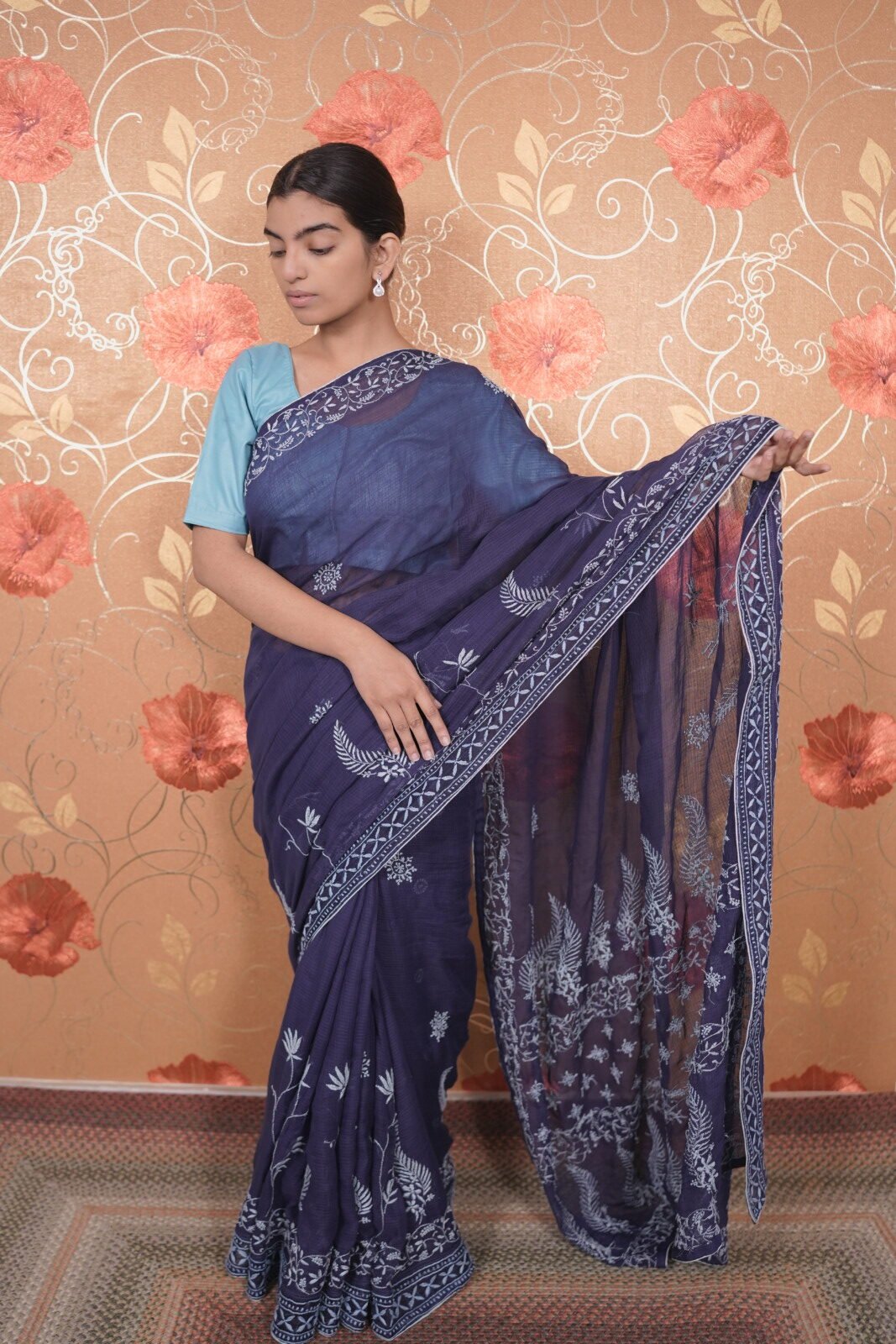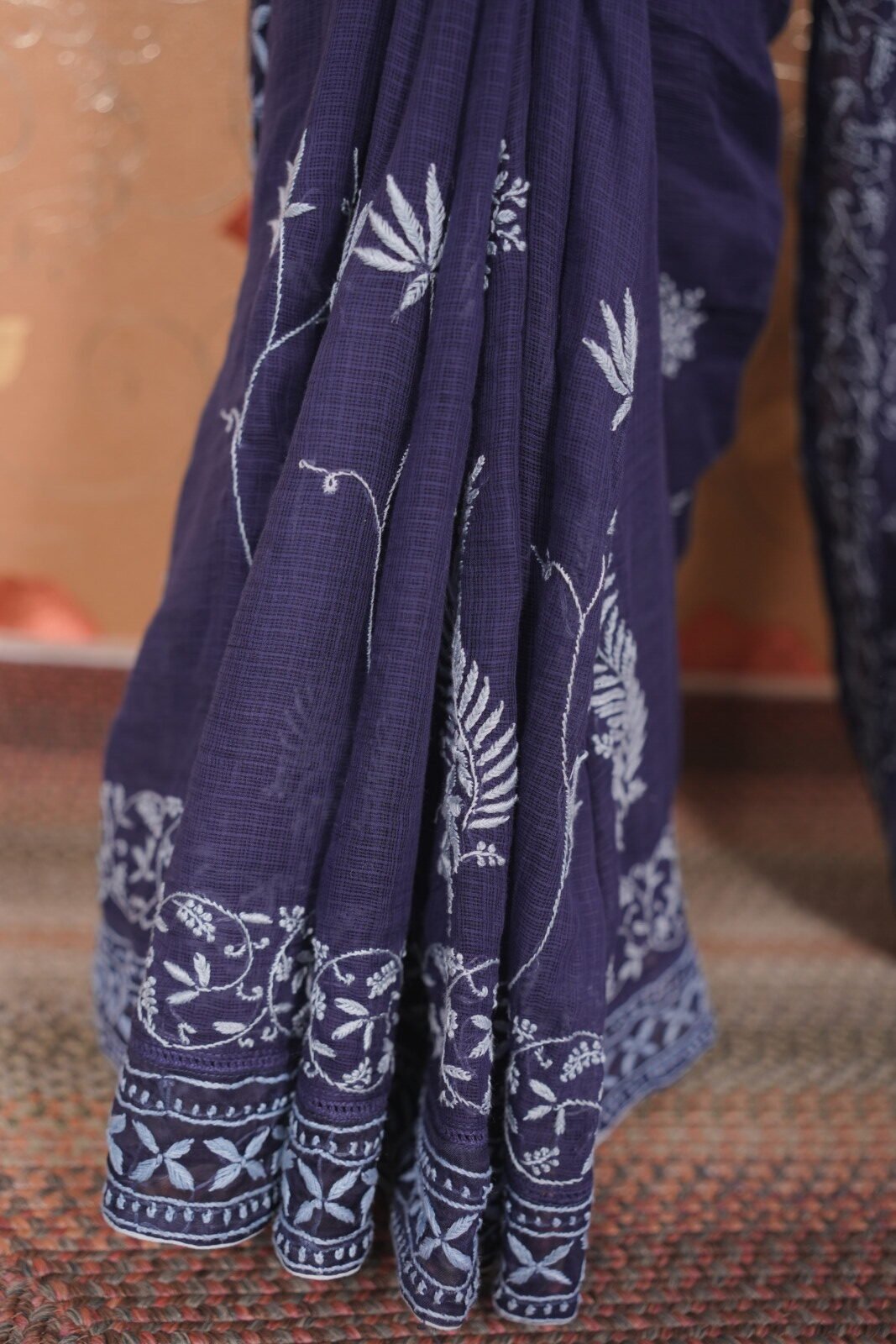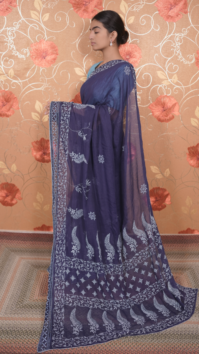 The saree has beautifull floral embroidery in grey threadwork. It comes with 1.5 metre blouse with lining. Its border has got a fine piping on the edge.