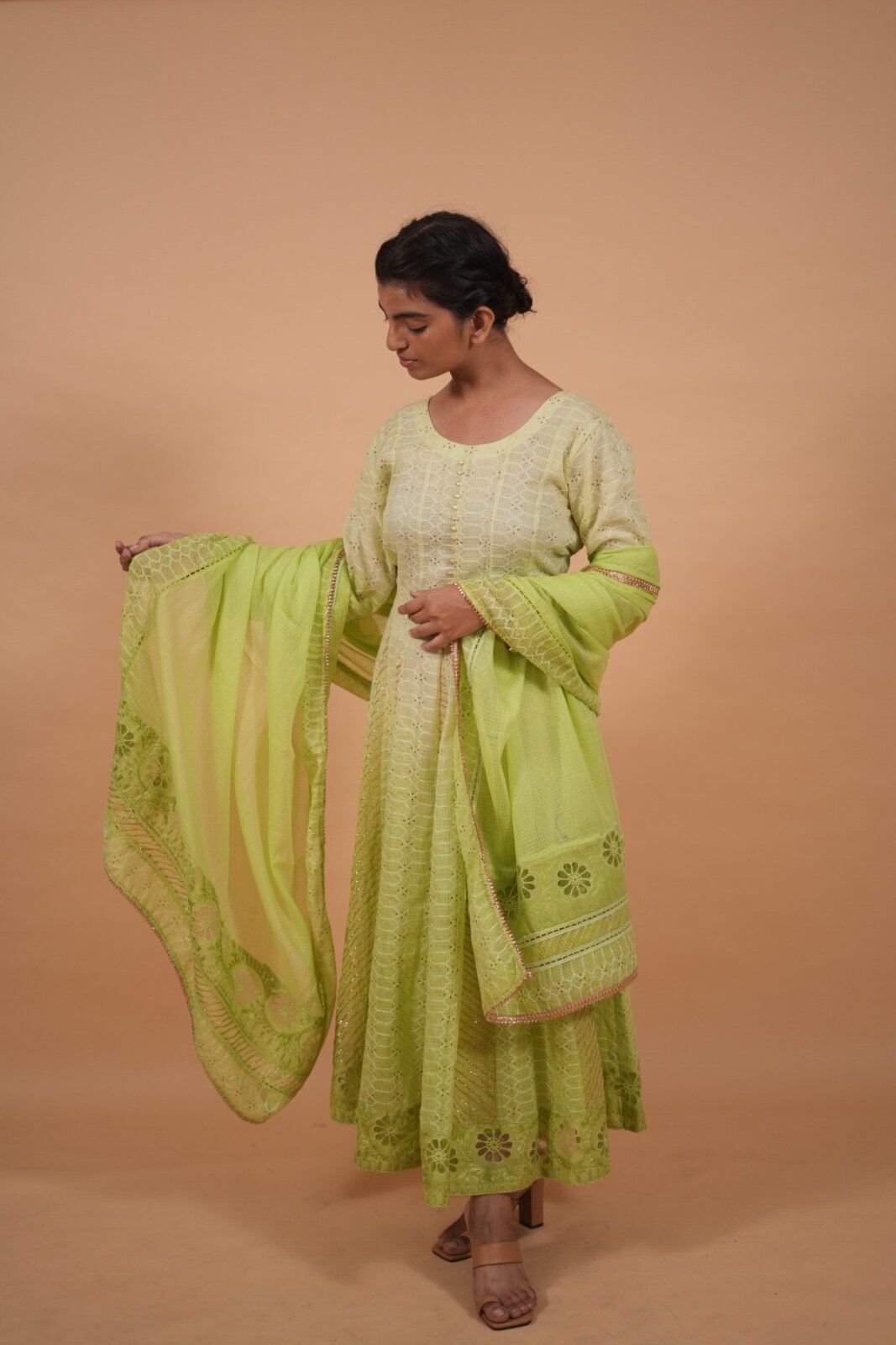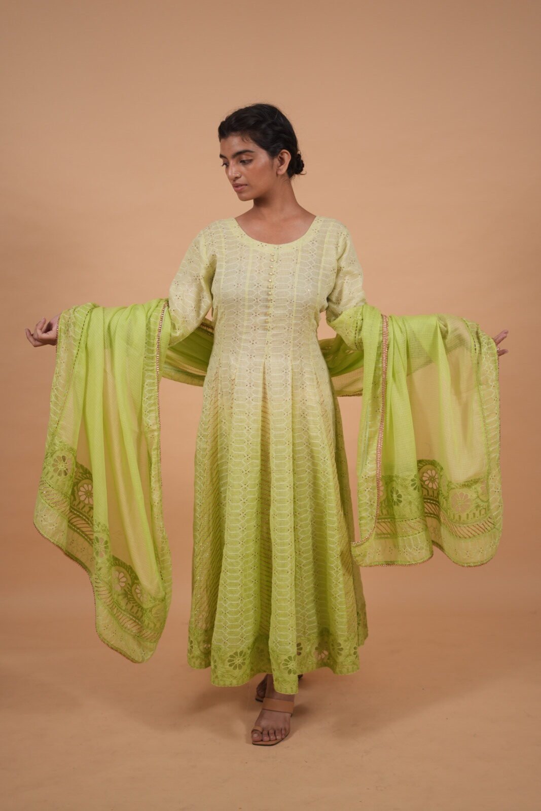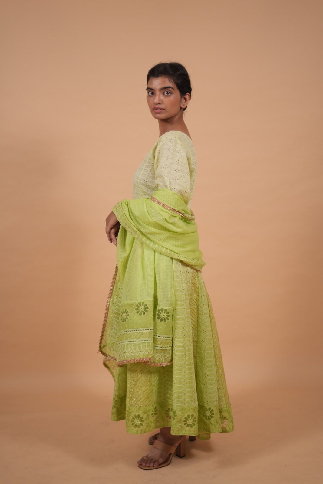 Lime Green colored Anarkali set of 4 pcs . It is delicately embroidered with ta-echi embroidery. It has gotta and Mukaish work all over and it is finished with a cutwork border. It has a very delicate kota Dupatta finished with a cutwork border and pintucks.