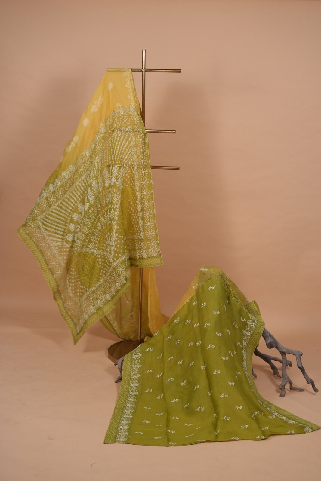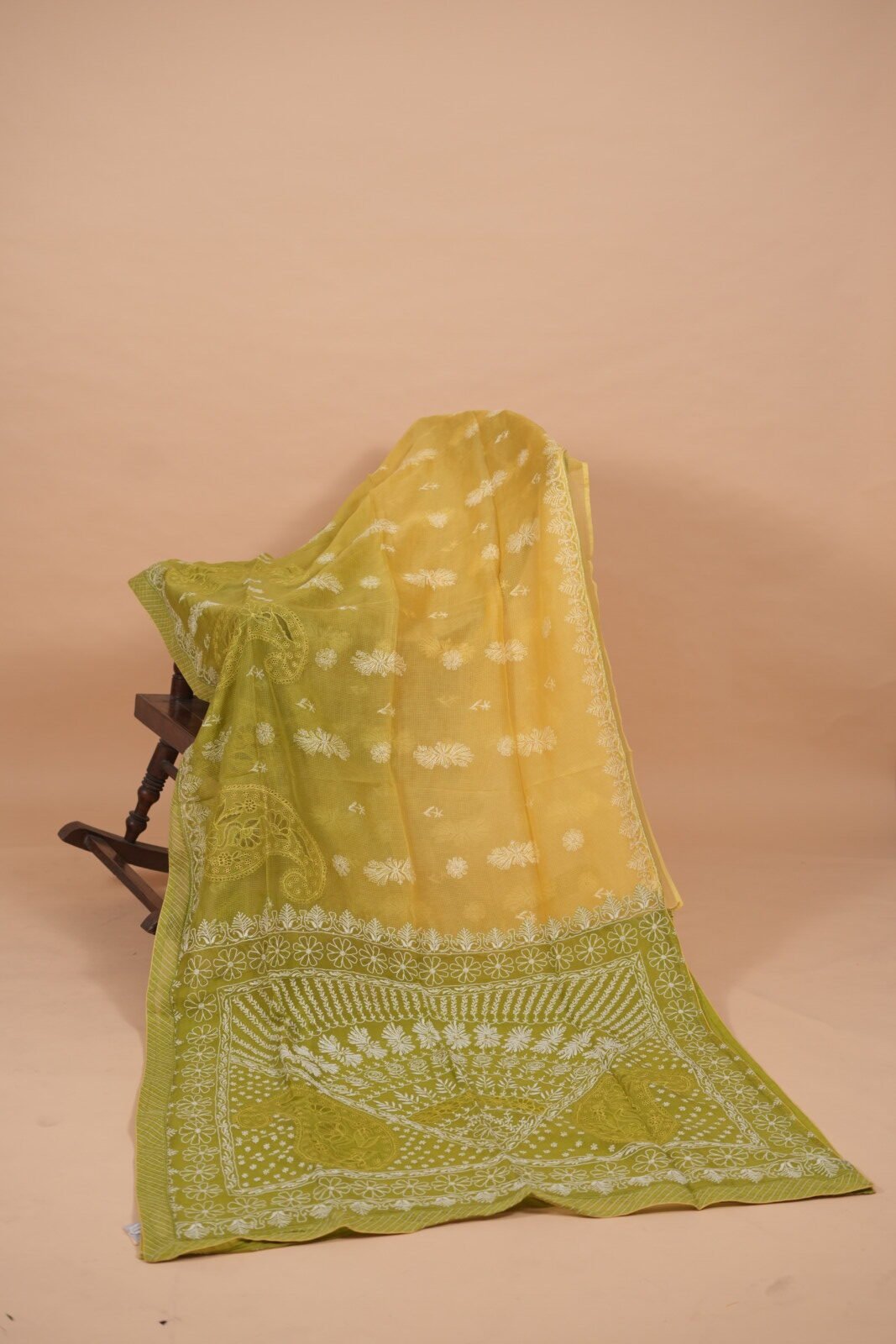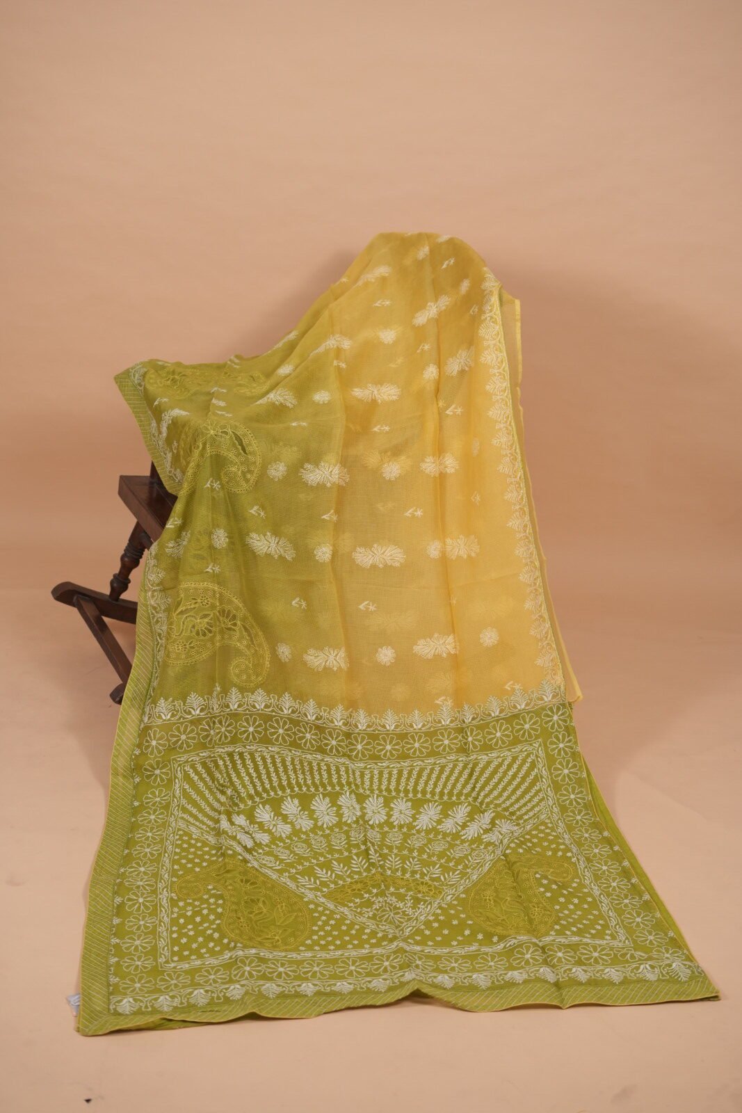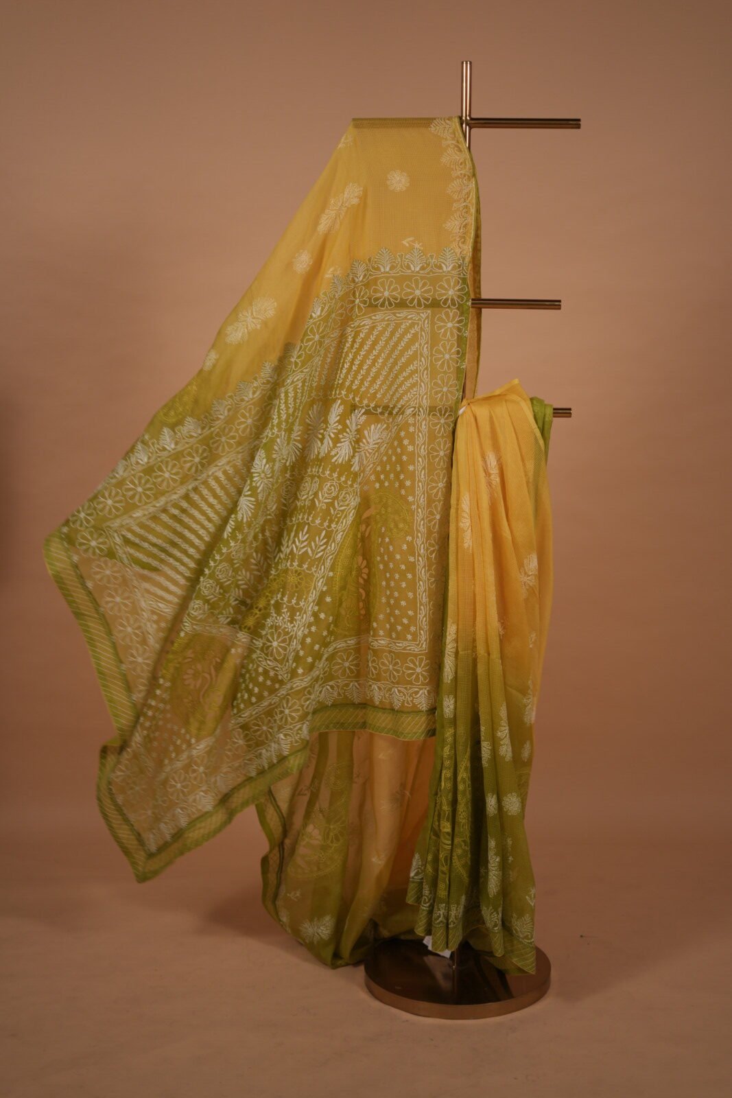 It is a beautiful hombre lemon and green shaded saree with ghaspatti embroidery, cutwork. It is finished with a pintucks border. The saree comes with a 1 metre blouse and lining.