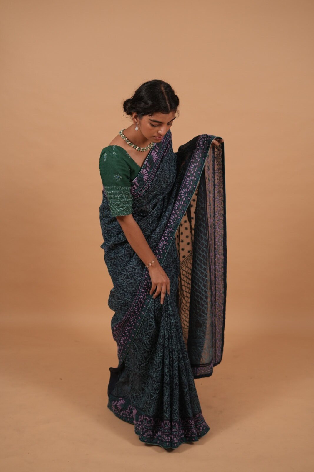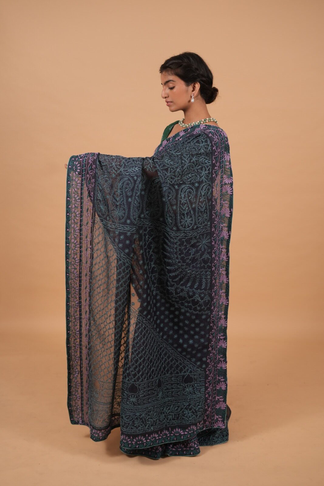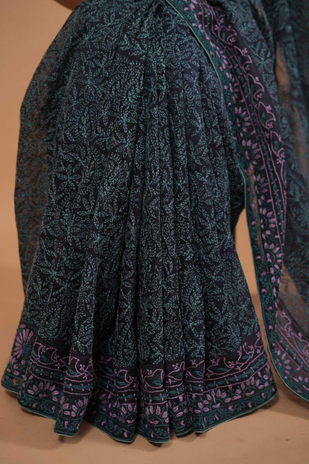 Ink Blue Silk Organza Saree with light blue tapechi embroidery