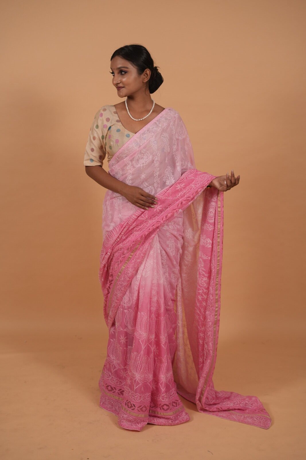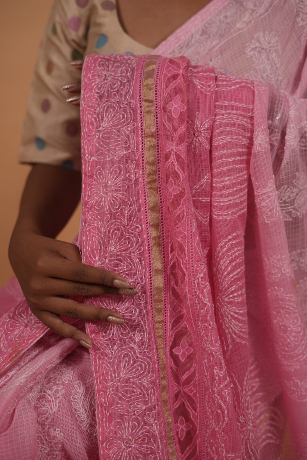 Kota hombre shaded saree in pink with tapechi embroidery. It has a cutwork border . It is finished with a golden border and lace. The saree comes with a 1 metre blouse and lining.