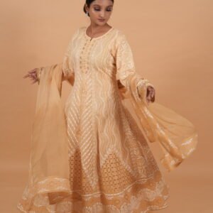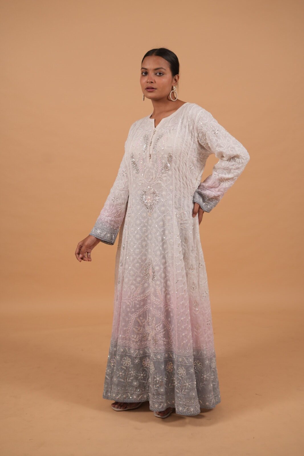 It is a kota Anarkali with hombre shading of grey, pink & cream. Anarkali is embroidered with delicate tapaechi and Zardozi handwork.The Anarkali is paired with a beautiful chiffon dupatta.
