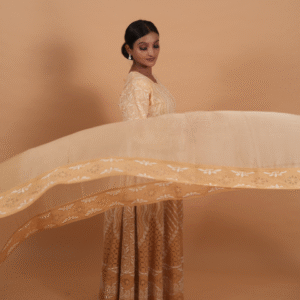 Beige Silk Organza Semi-Stitched Suit Set with Heavy Sequins