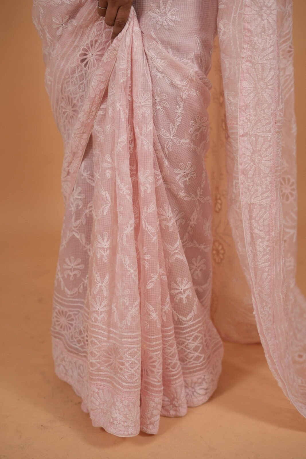 Coral and cream colored shaded saree in kota fabric. It has tapechi embroidery which is finished with a delicate cut work, pintucks and gota border. It comes with a 1 metre blouse attached with lining.