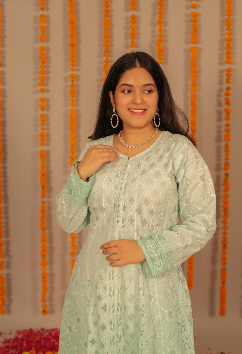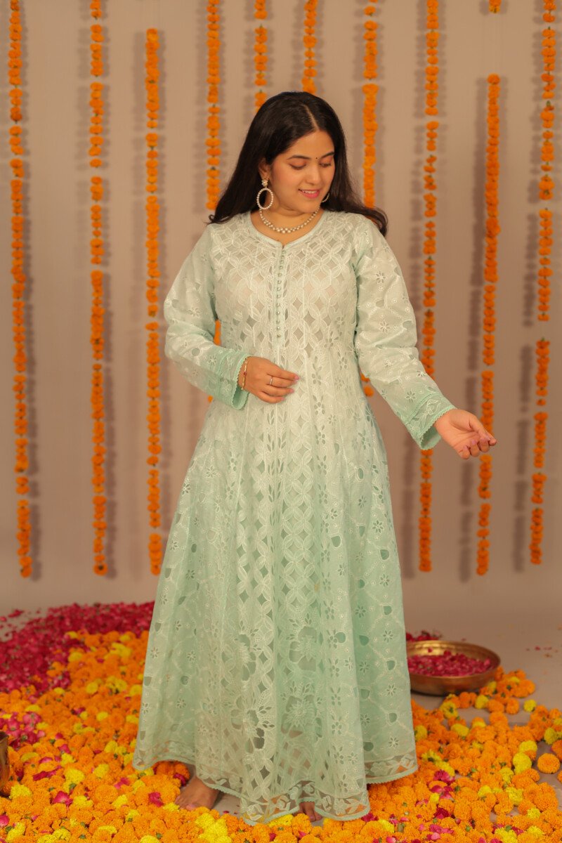 Light Blue cutwork Anarkali in cotton Voil. Full flared wrk and hand embroidered with precision. This Anarkali set comes with chiffon dupatta and matching bottom + lining.