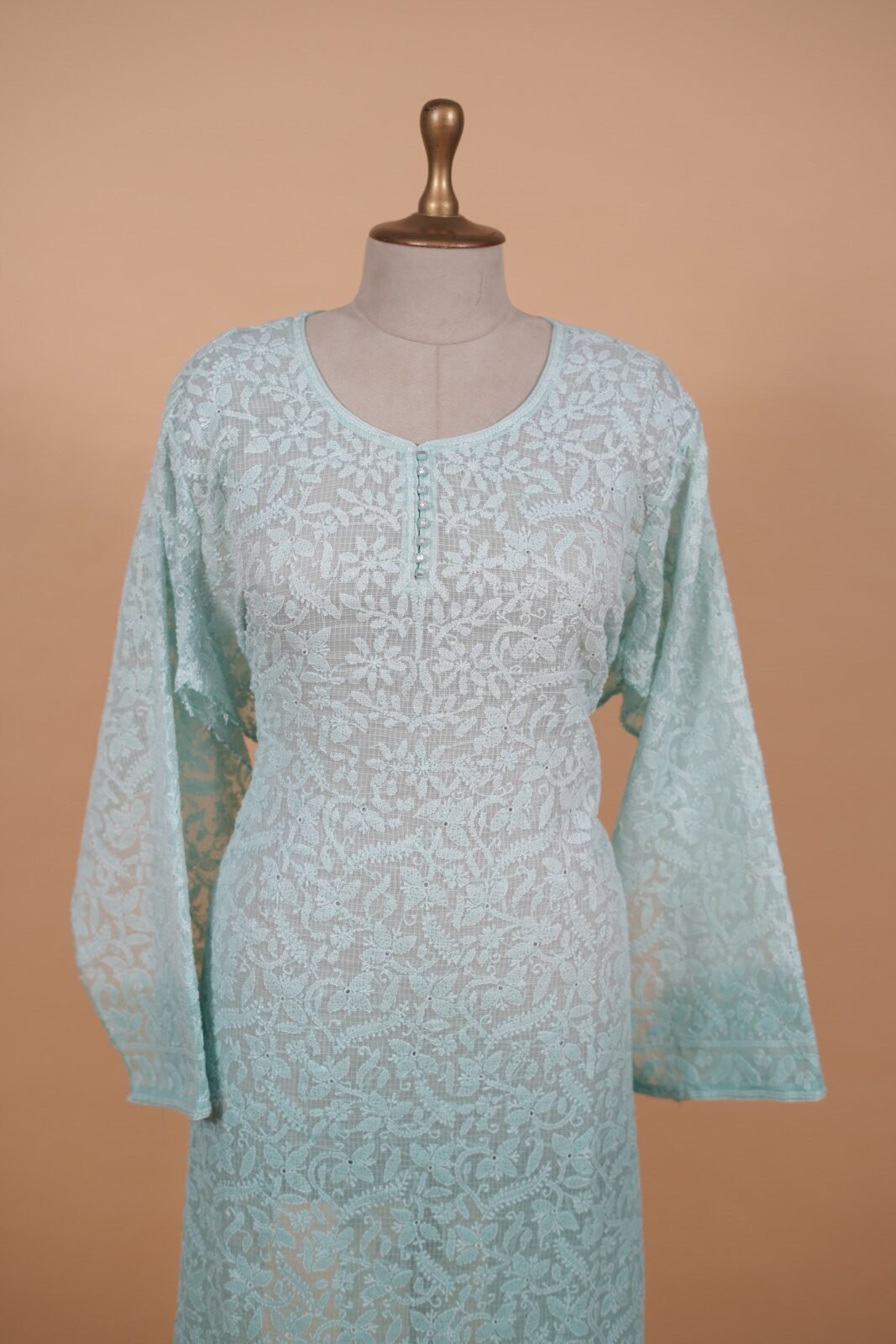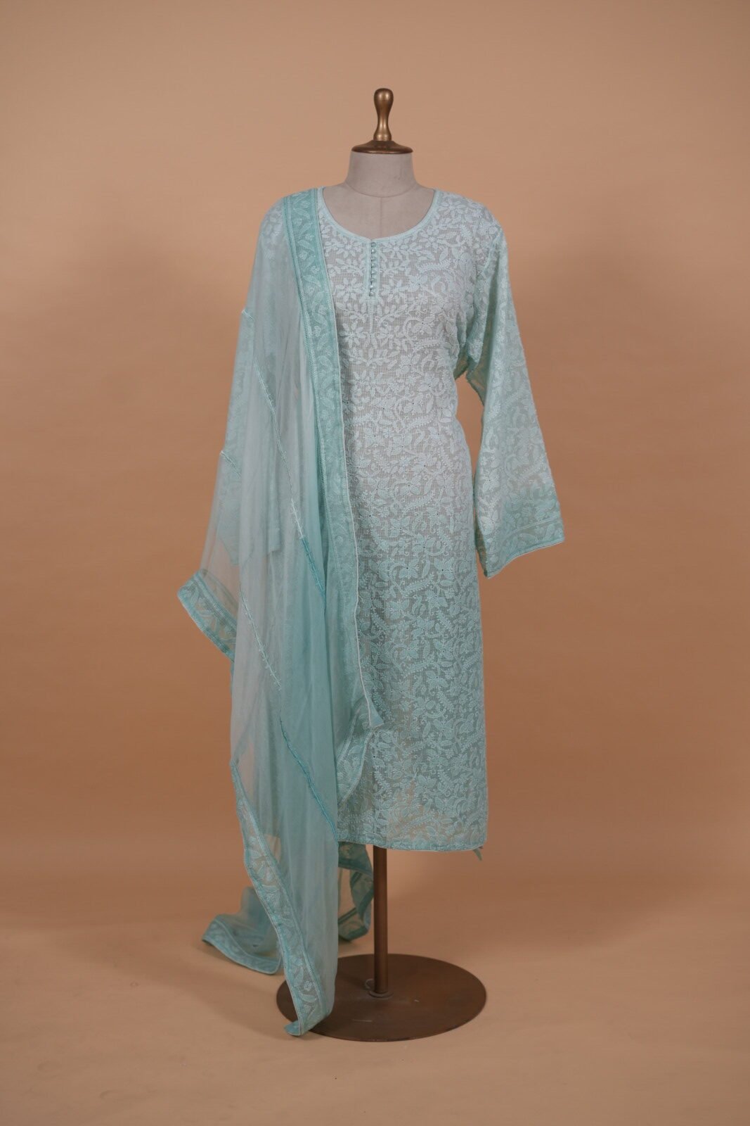 4 pc light blue homre color kota suit with bakhiya and phanda having a chiffon dupattain shading.