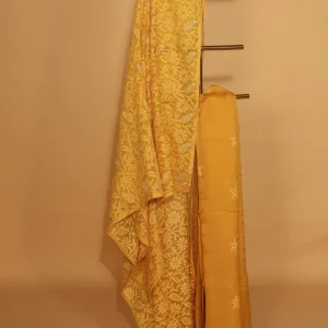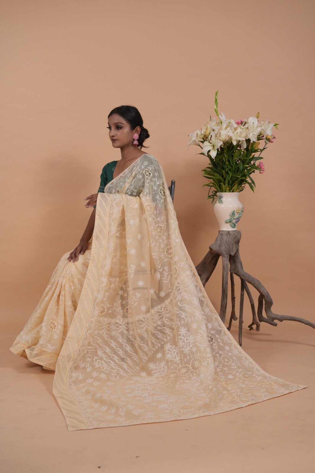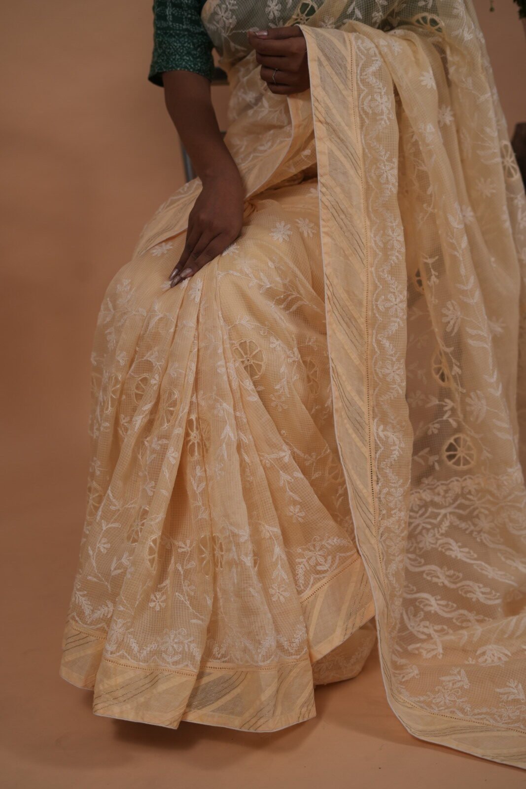Lime Yellow Cheque Organza Saree with tapechi embroidery and cutwork. It is finished with a pintucks border. The saree comes with a 1 metre blouse and lining.