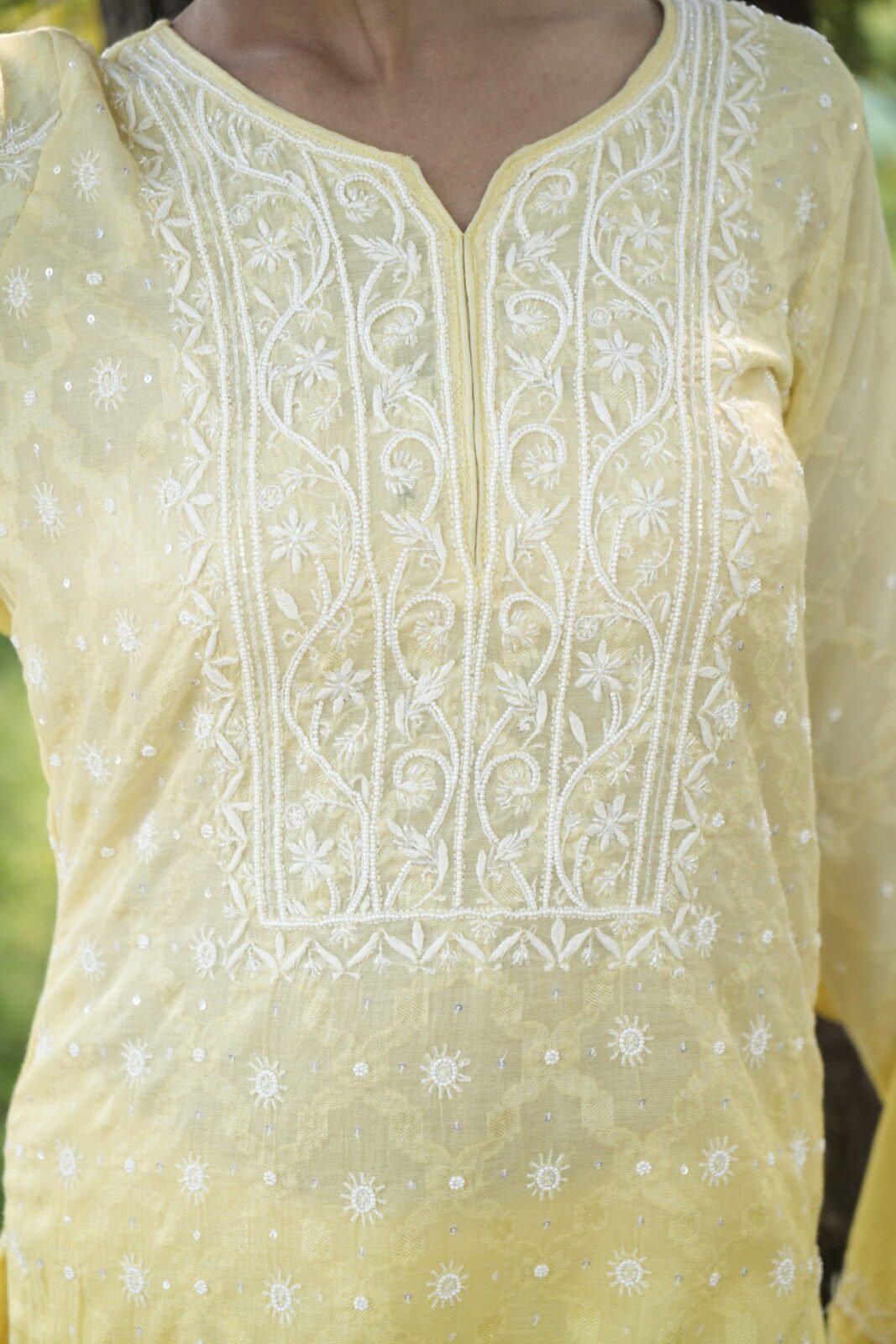 Fresh lime yellow chikankari suit set featuring detailed embroidery and beadwork for a bright and cheerful ethnic look.