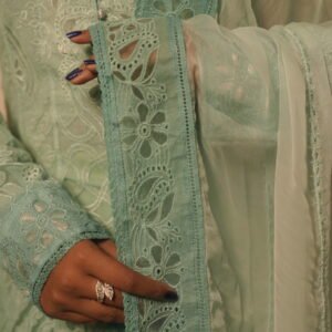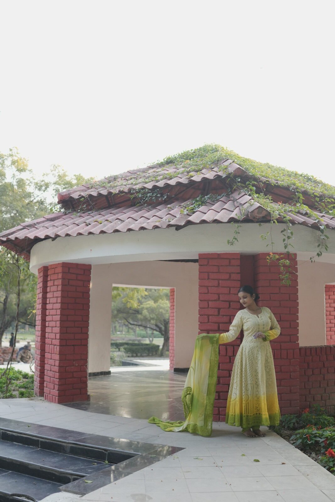 Lime yellow Anarkali set in soft cotton voil with subtle home green shading. Lightweight, breathable and perfect for festive and daytime ethnic wear.