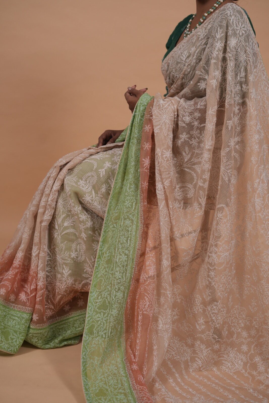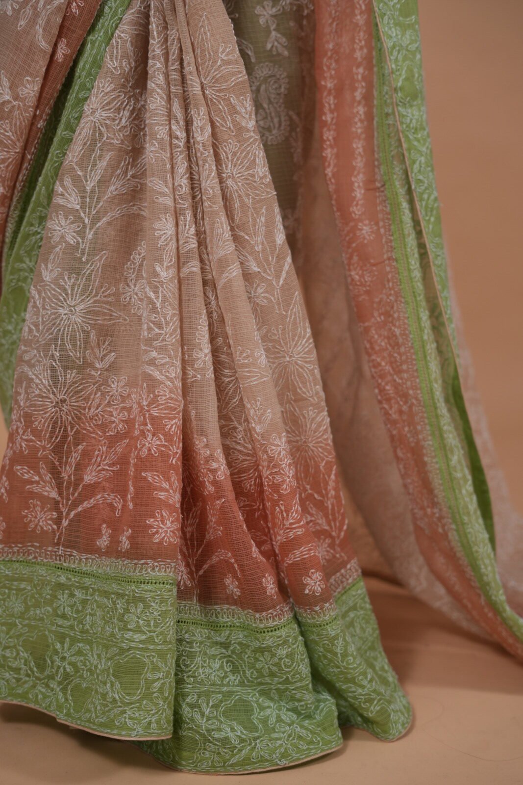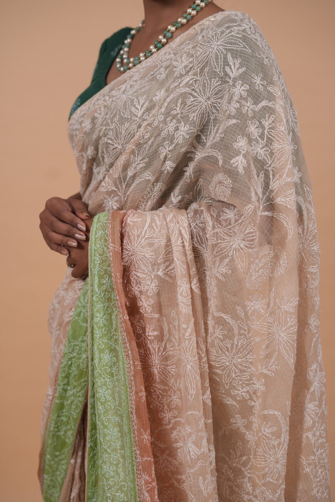 Beige colored kota saree with multicolored green and coral pink shaded border. It is embroidered with delicate tapechi stitch. It comes with a 1 metre blouse with lining.