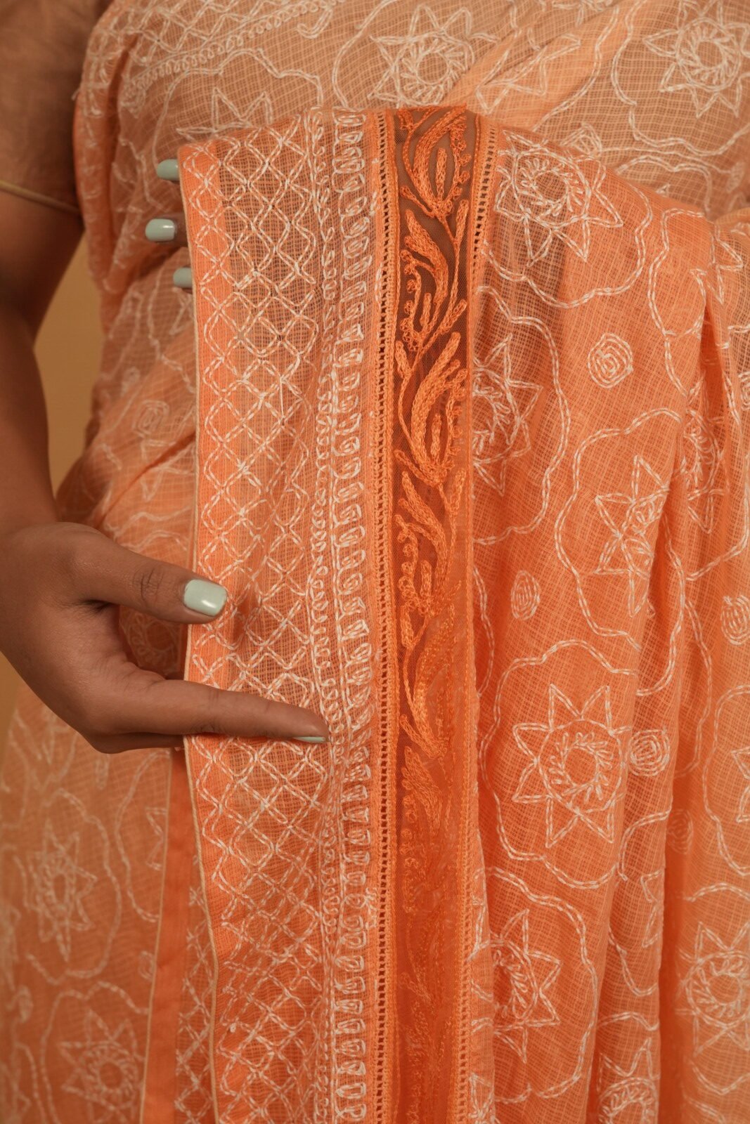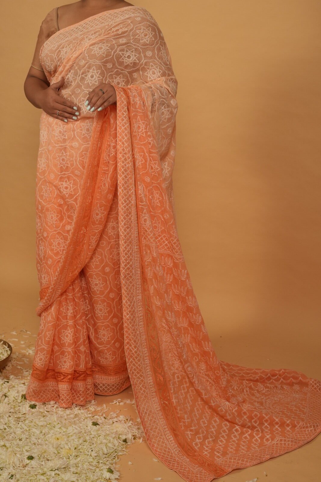 This saree has all over tapechi embroidery with peach shading on the body. The border has got cutwork amd orange thread embroidery. Saree has got 1.5 metre blouse with lining.