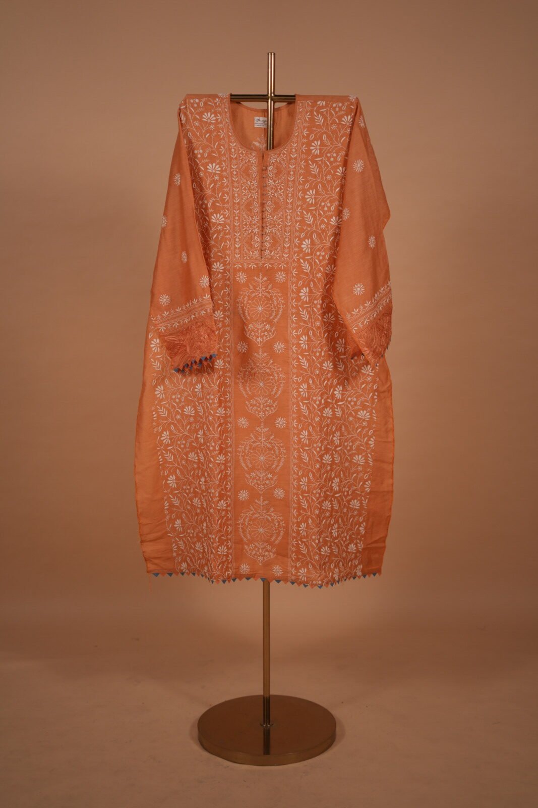 Peach Silk Organza Semi-Stitched Suit with Zardozi & Chikankari