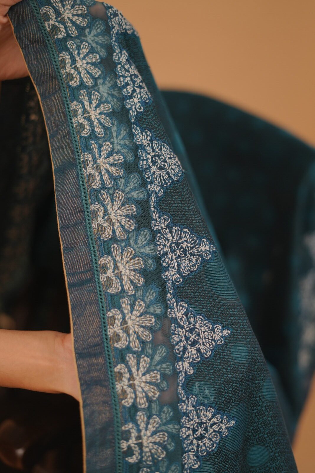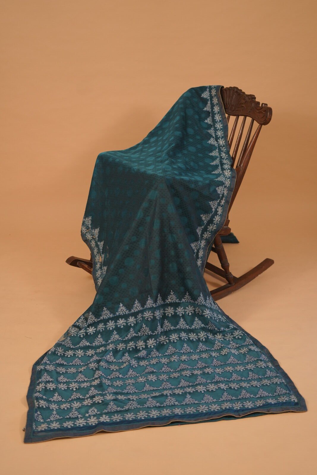 Peacock blue embroidered Saree with blouse attached and lining. The saree has got a beautiful dark blue color tone with white thread embroidery.