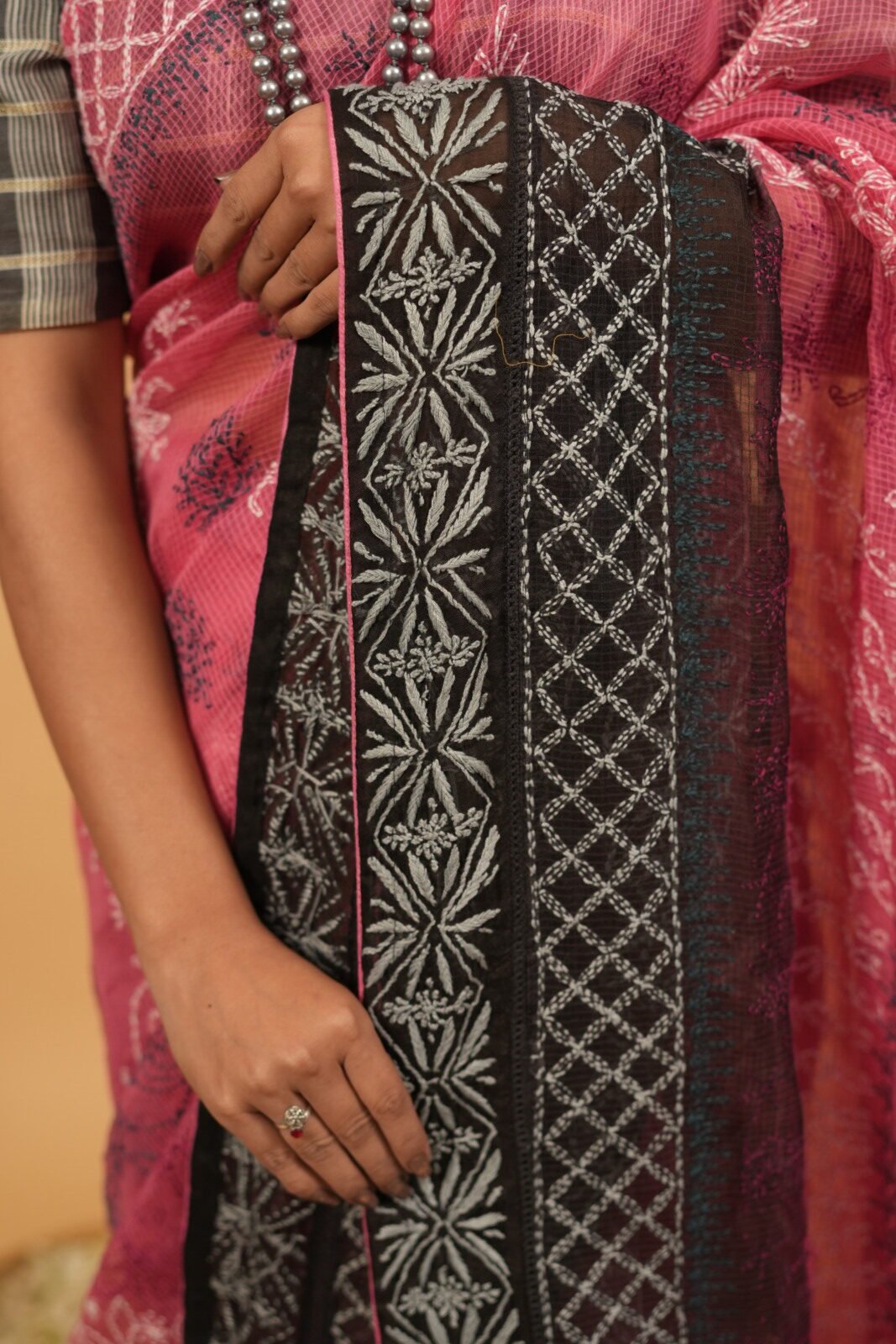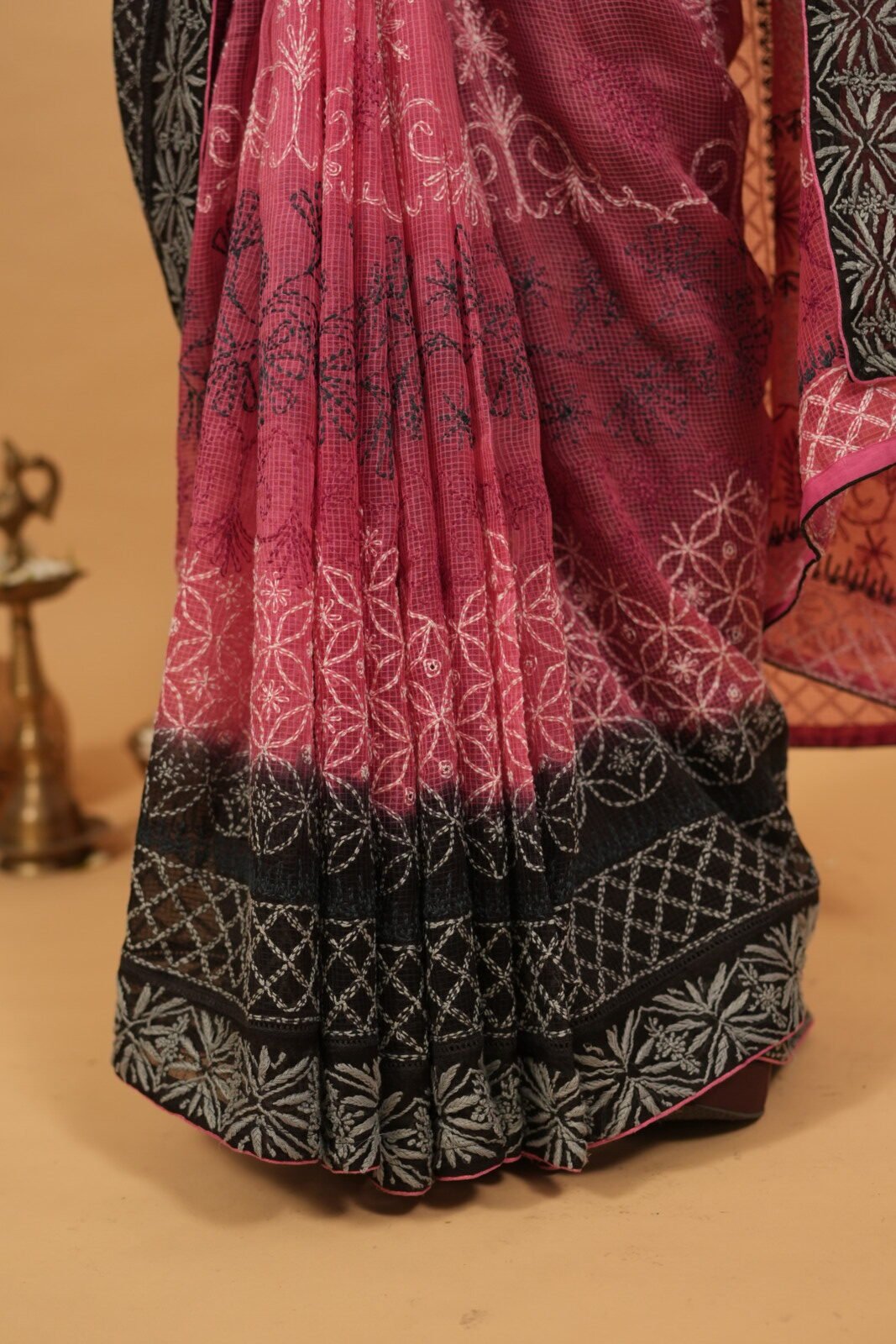 The saree has got all over embroidery with contrasting black 1.5 metre blouse and lining. The saree has a darker tone of pink ghaspatti embroidery work.