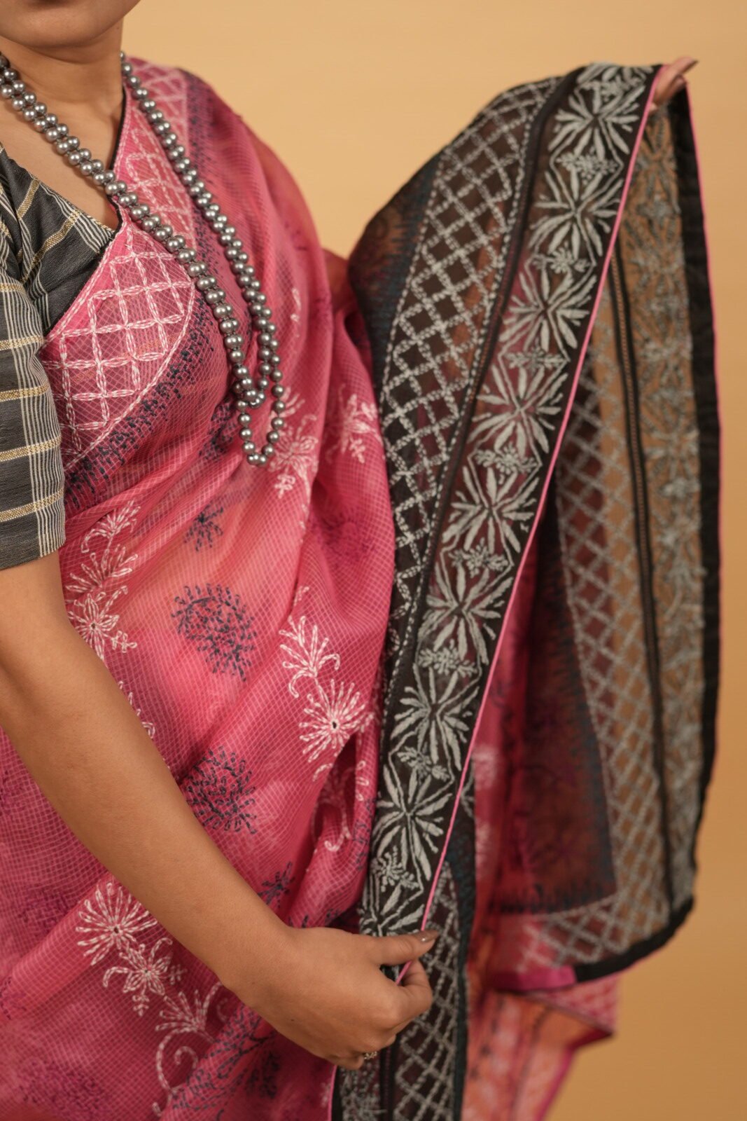 Pink cheque organza saree with black blouse and border
