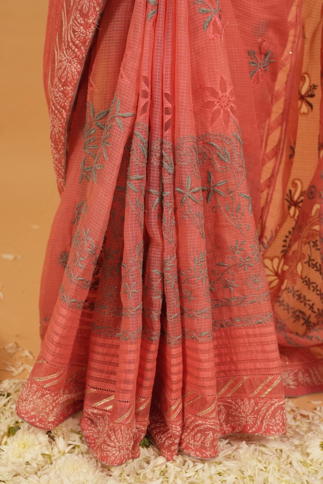 Pink kota saree with gota patti border, cutwork & pintucks highlighting