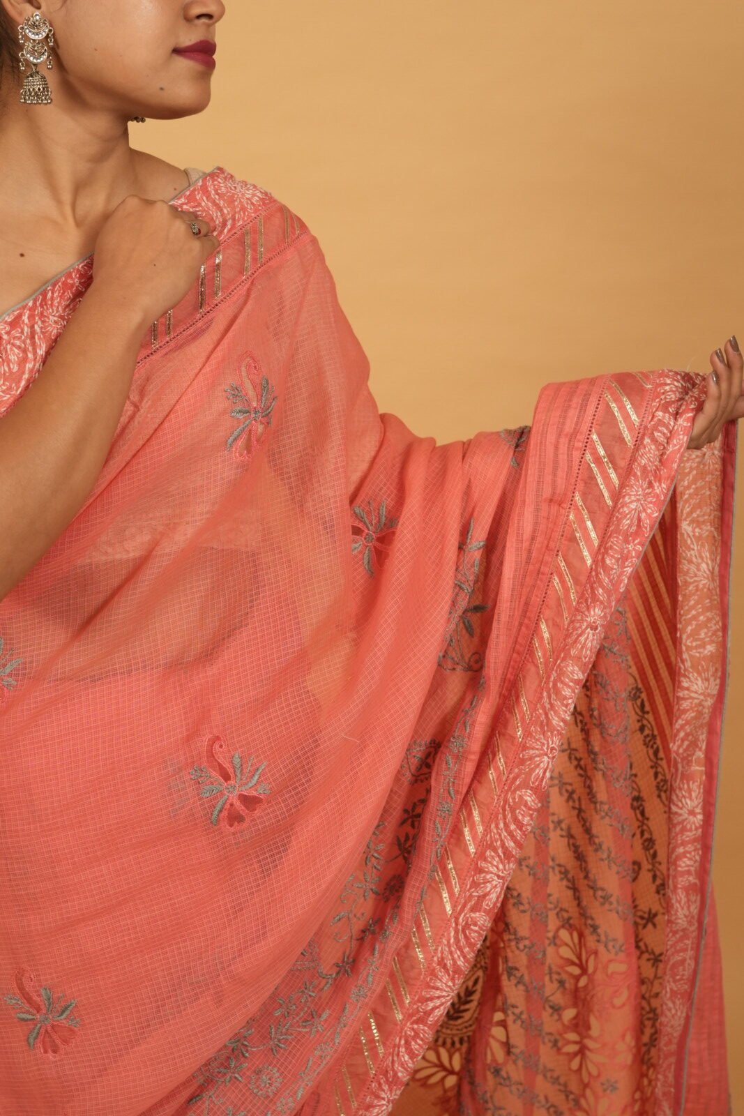 Pink kota saree with gota patti border, cutwork & pintucks highlighting. The saree has got 1.5 metre blouse with lining.The saree has got all over cut woork and ghaspatti embroidery in blue color threadwork to give it a refined look.