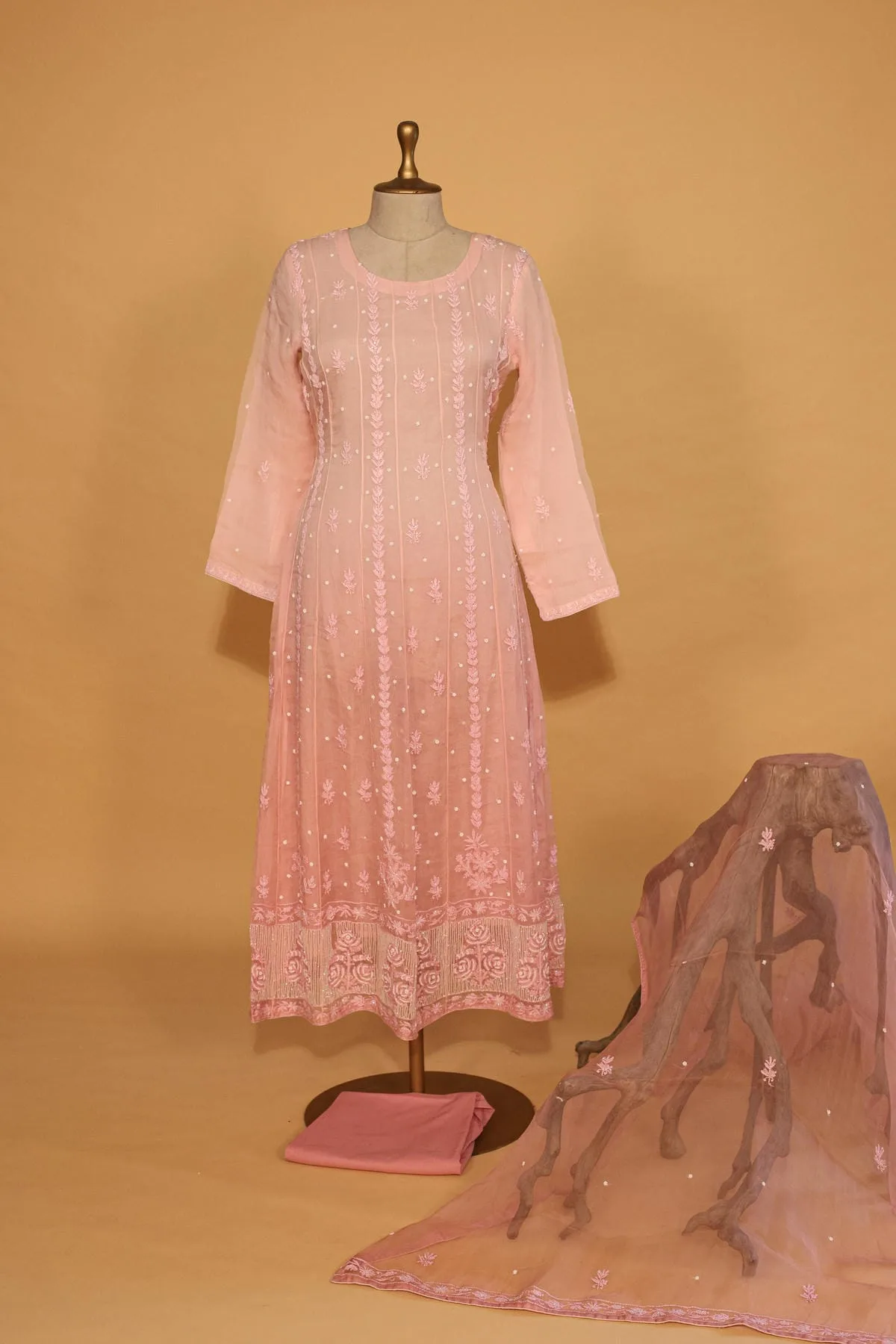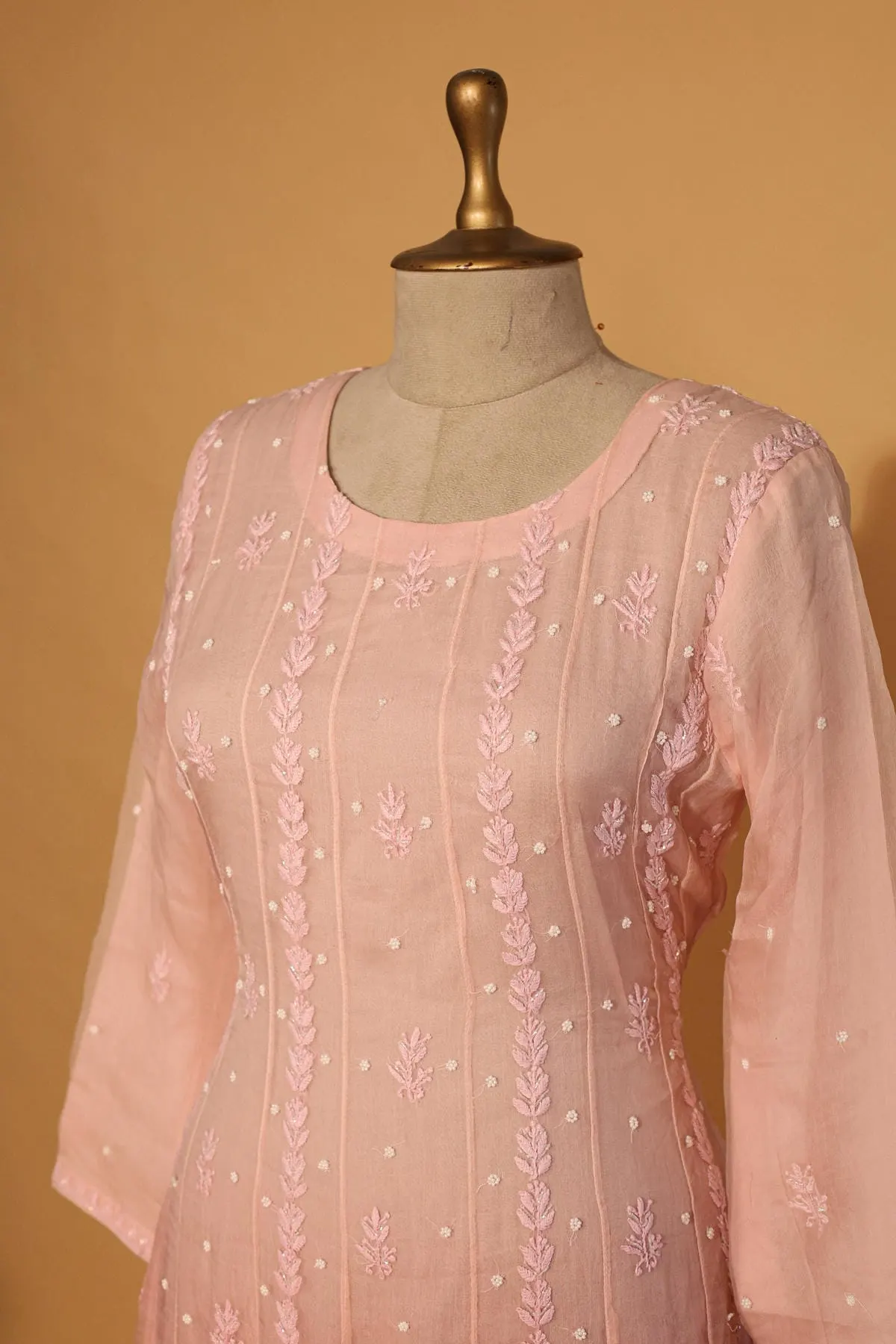Shine at every occasion with this Pink Silk Organza Suit Set, crafted from luxurious silk organza. This stitched 3-piece suit is adorned with exquisite sequins work, adding elegance and glamour to your festive or semi-formal look.