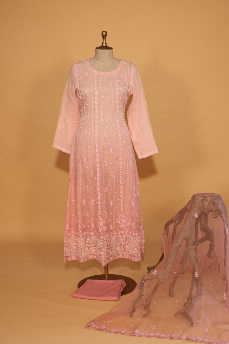 Pink Silk organza suit set with cutdana, embroidery and dupatta