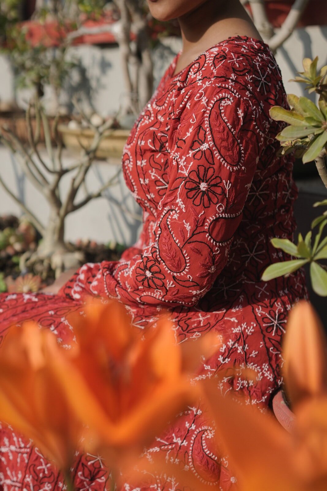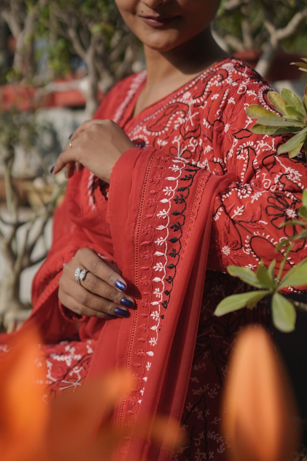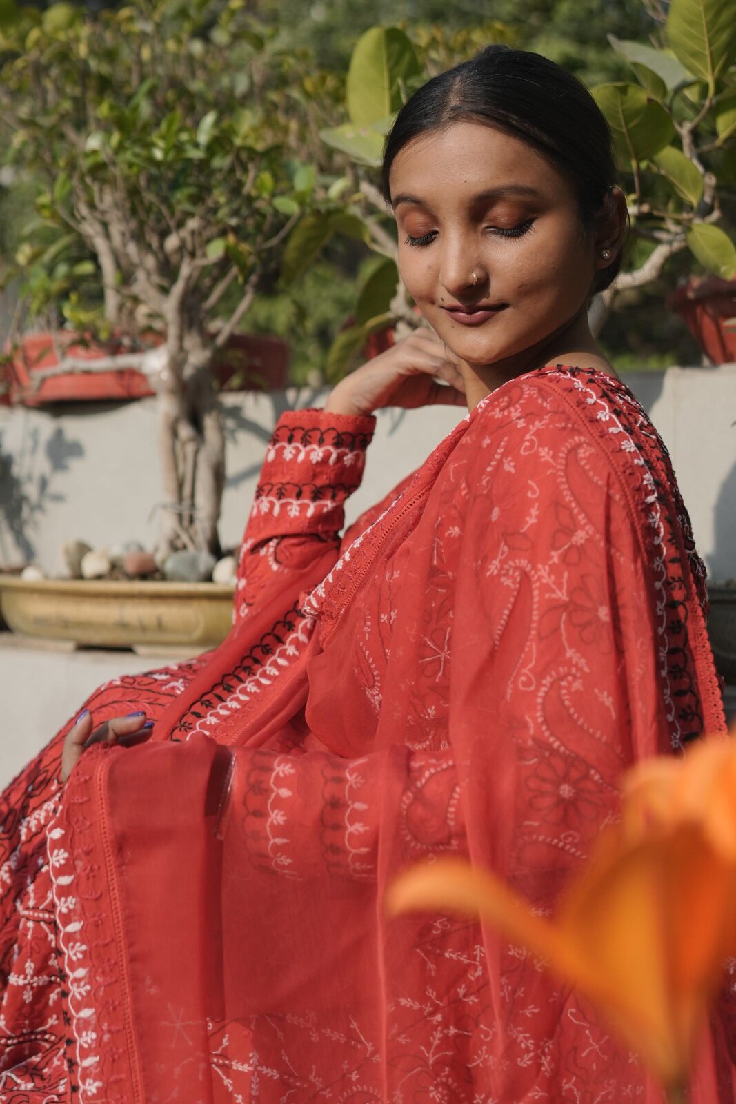 Bright Orange Coimbatore Cotton Chikankari Suit Set – 4 Piece