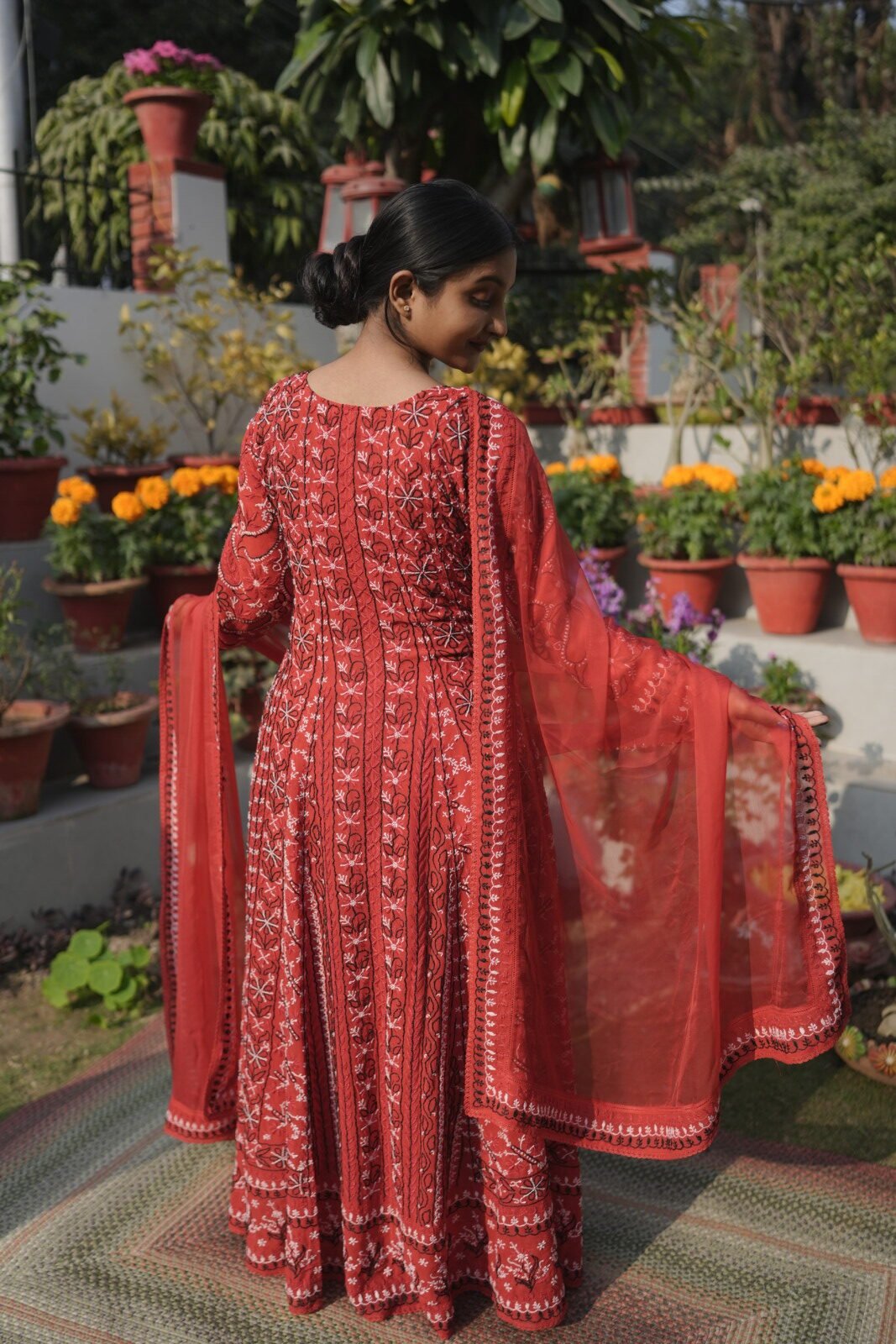 Red Anarkali featuring elegant black thread work. Graceful silhouette, rich contrast and perfect for festive occasions and special celebrations.