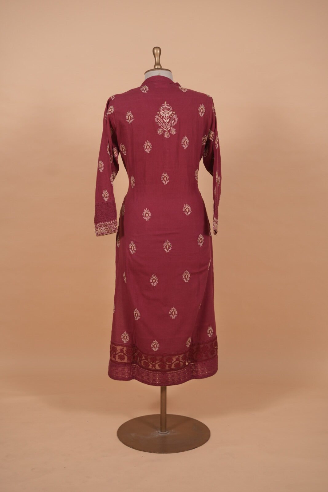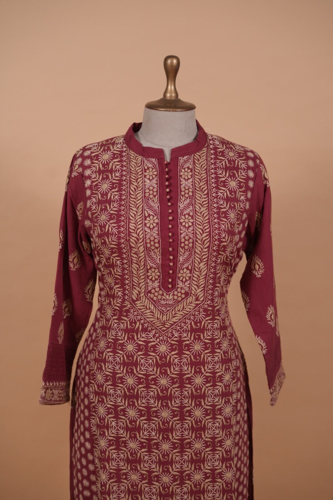 Red colored coimbaitore cotton suit with beige colored embroidery in ghaspatti and phanda stitch. It has add on of cut work and a shaded chiffon dupatta.