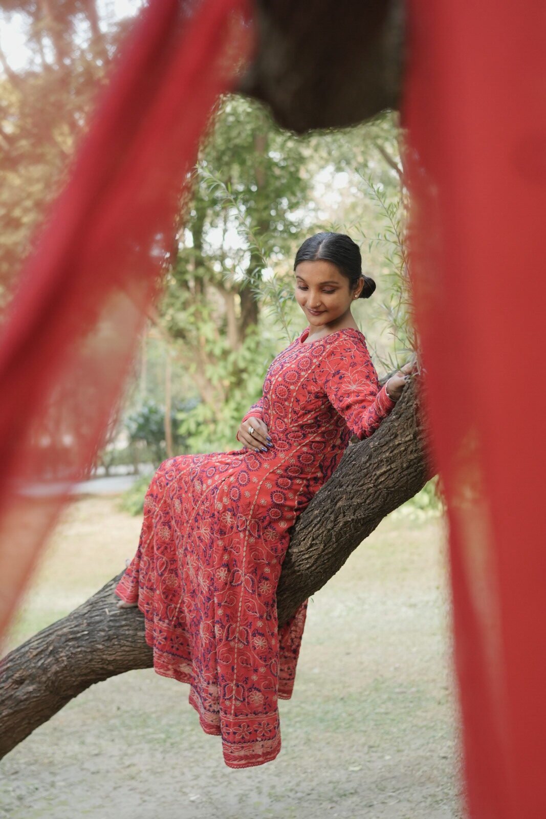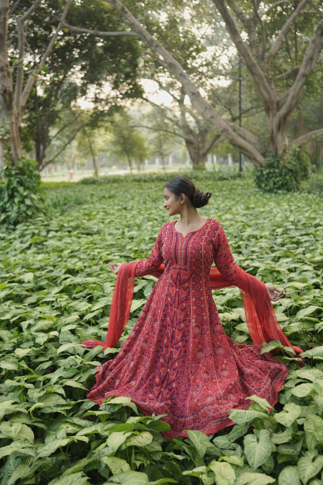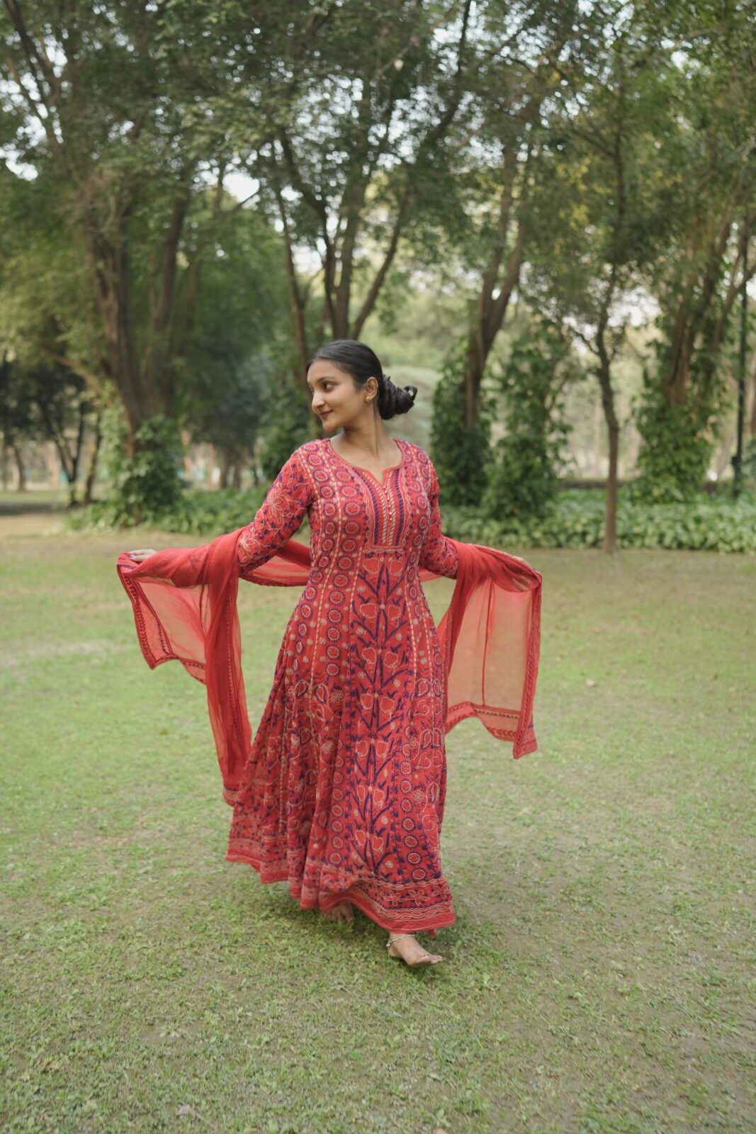 Red georgette Anarkali with blue thread work. Lightweight, flowing, and perfect for festive occasions and celebratory ethnic wear.