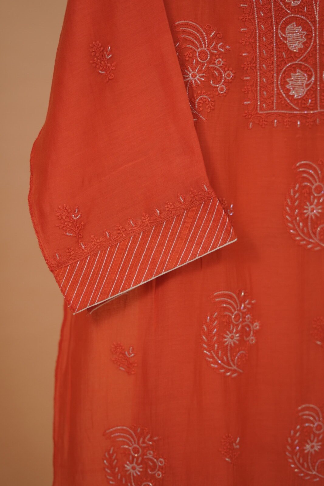 Red Mulchanderi suit set with embroidered work (4pcs). The suit set with decorated with handmade chikankari embroidery work. Bottom, Lining and dupatta is also included.
