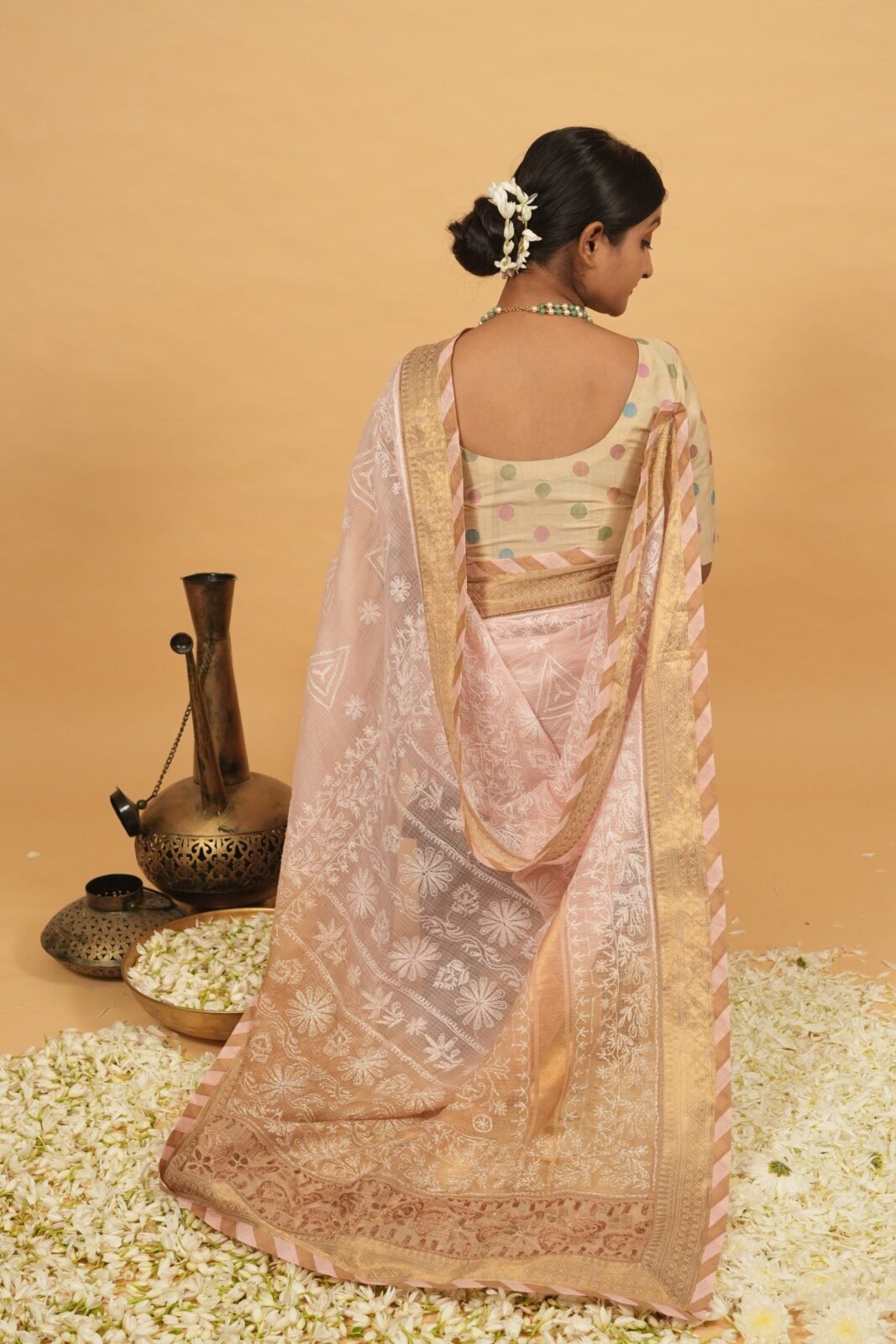 The saree has cutwork border with zari and pintucks highlighting in classic brown shade. It comes with a 1.5 metre blouse with lining attached. It has all over ghaspatti embroidery with beautiiful contrast shading of white threadwork on babuy pink.