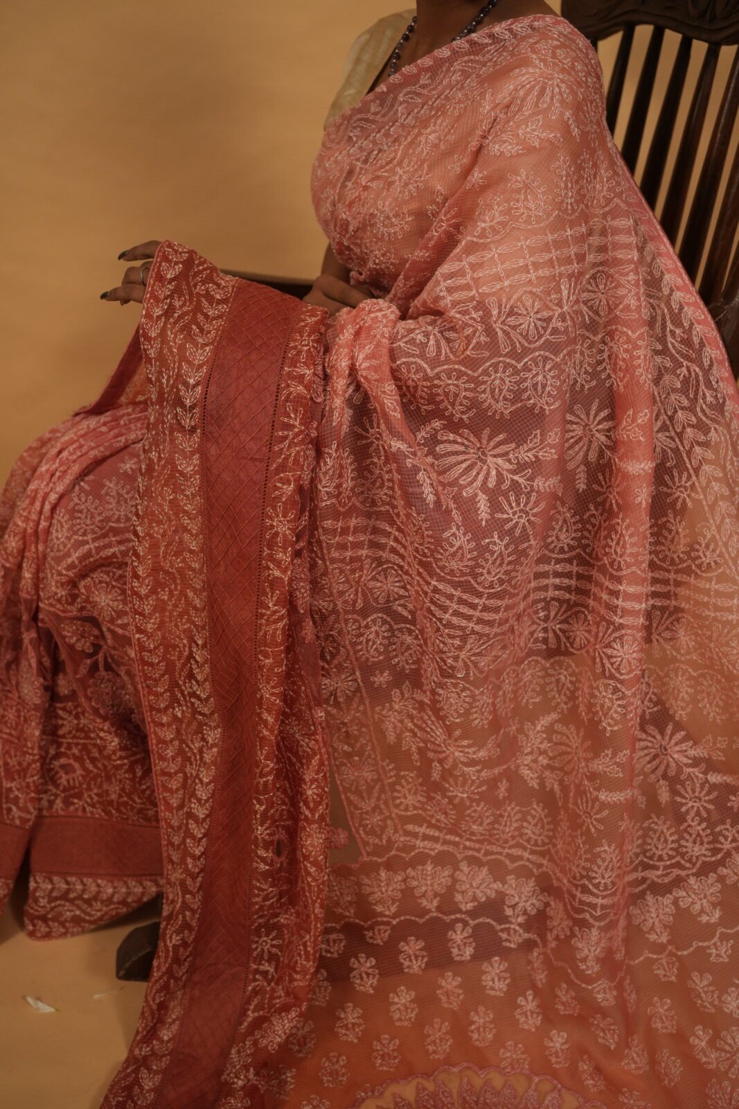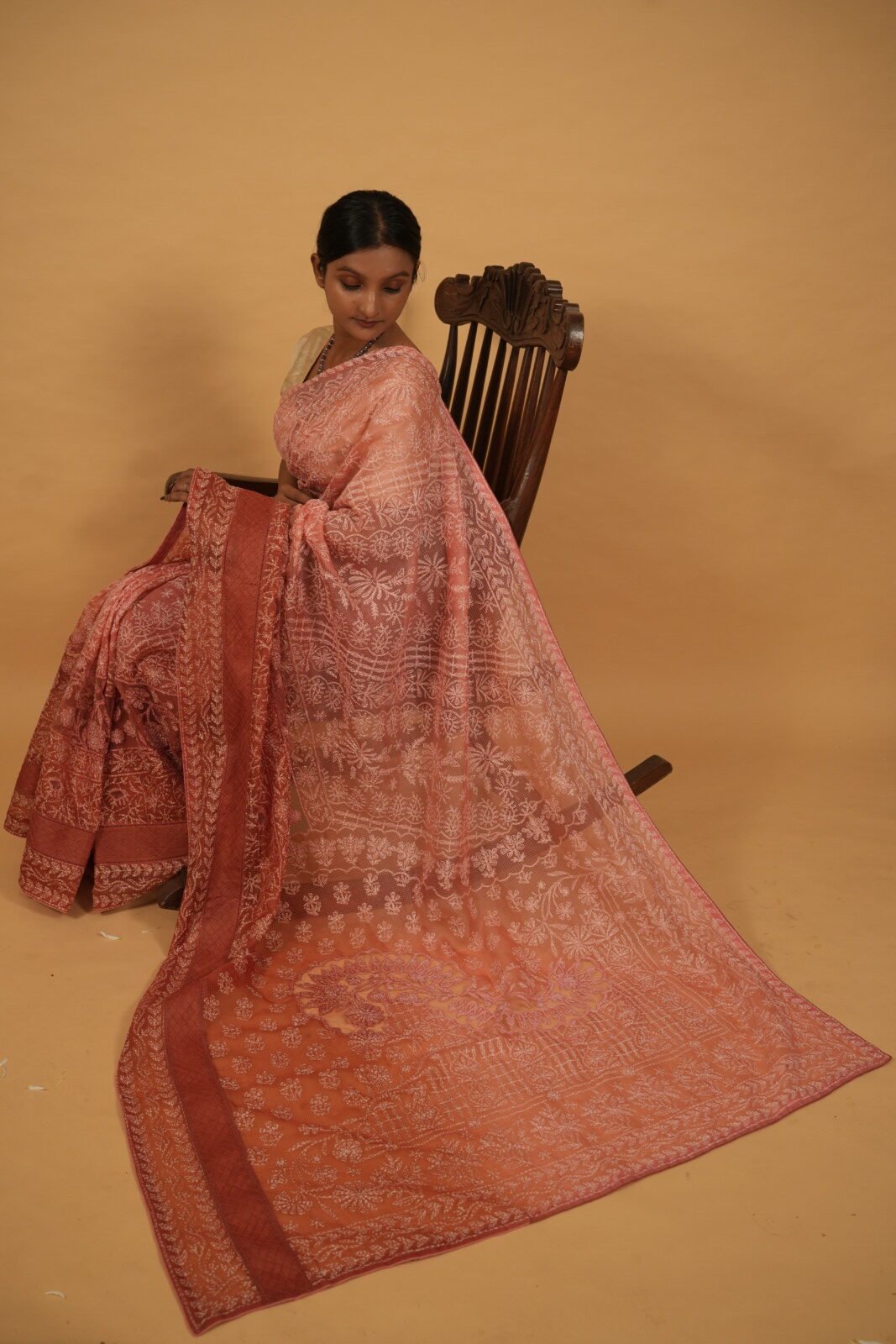 The saree is embroiderd with Ghaspatti and tapechi embroidery and adorned with cutwork on pallu. The saree comes with 1.5 metre blouse attached with lining.