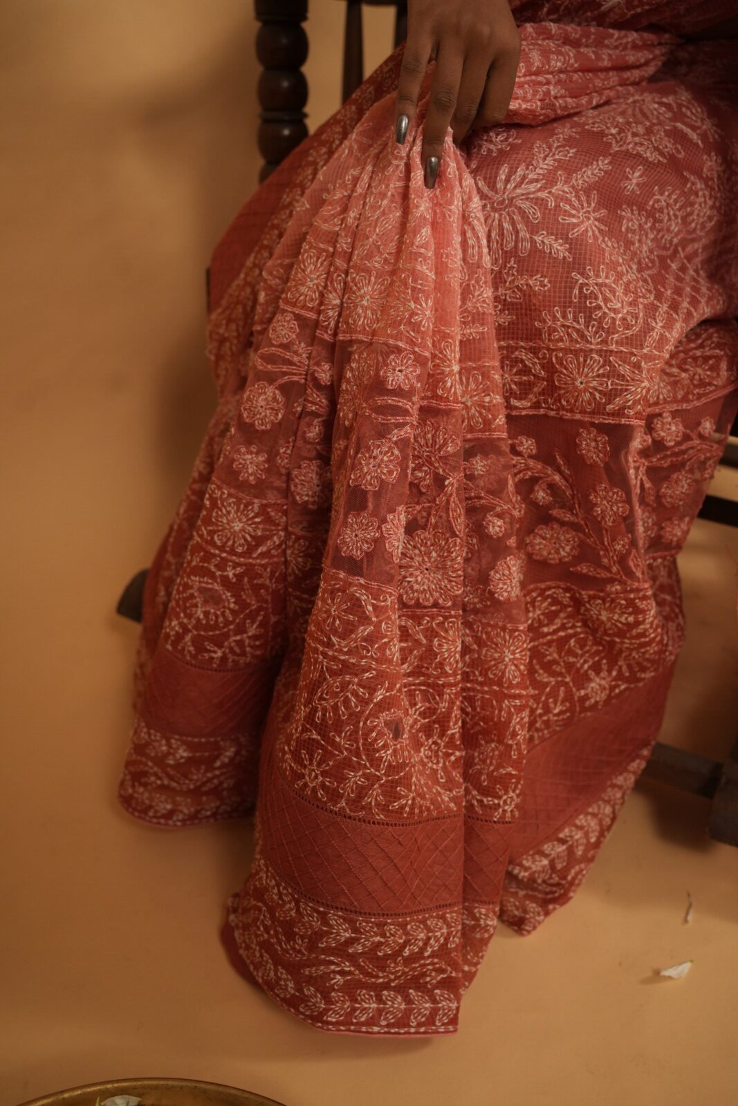 Rust brown cheque organza saree with pintucks border and cutwork on pallu