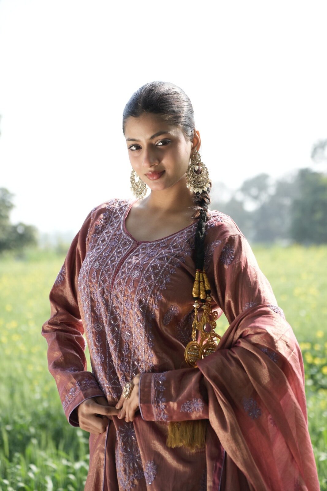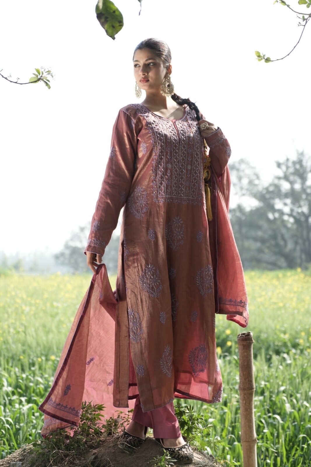 Elegant rust brown chikankari suit set featuring intricate hand embroidery and beadwork for timeless ethnic styling.