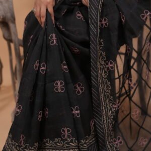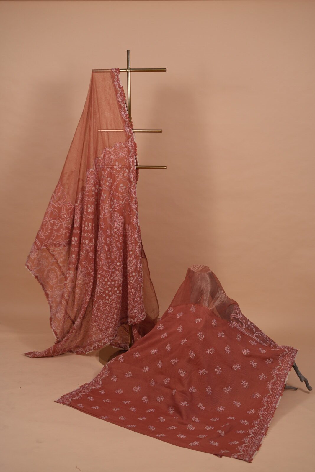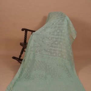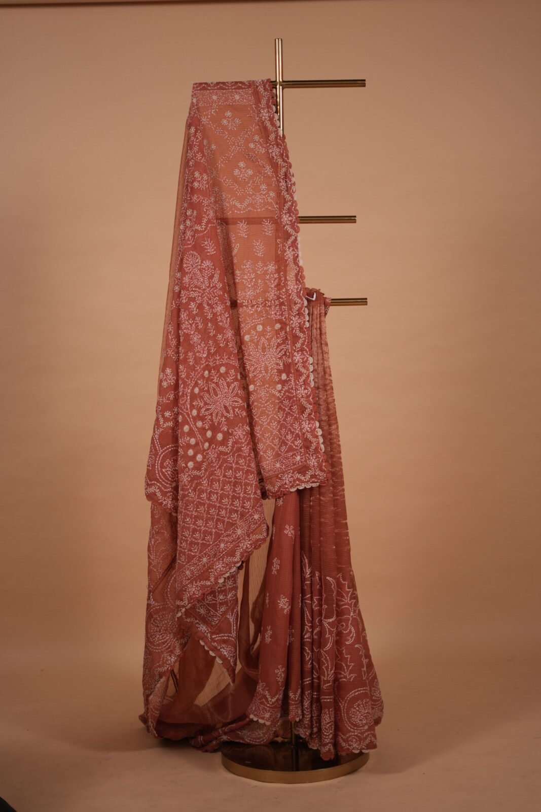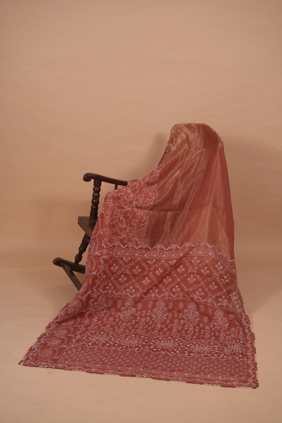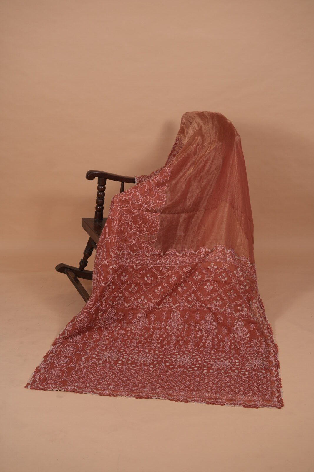 Rust brown kota tissue saree with ghaspatti, phanda, palla blouse. It is finished with delicate java. The saree comes with a 1 metre blouse and lining.