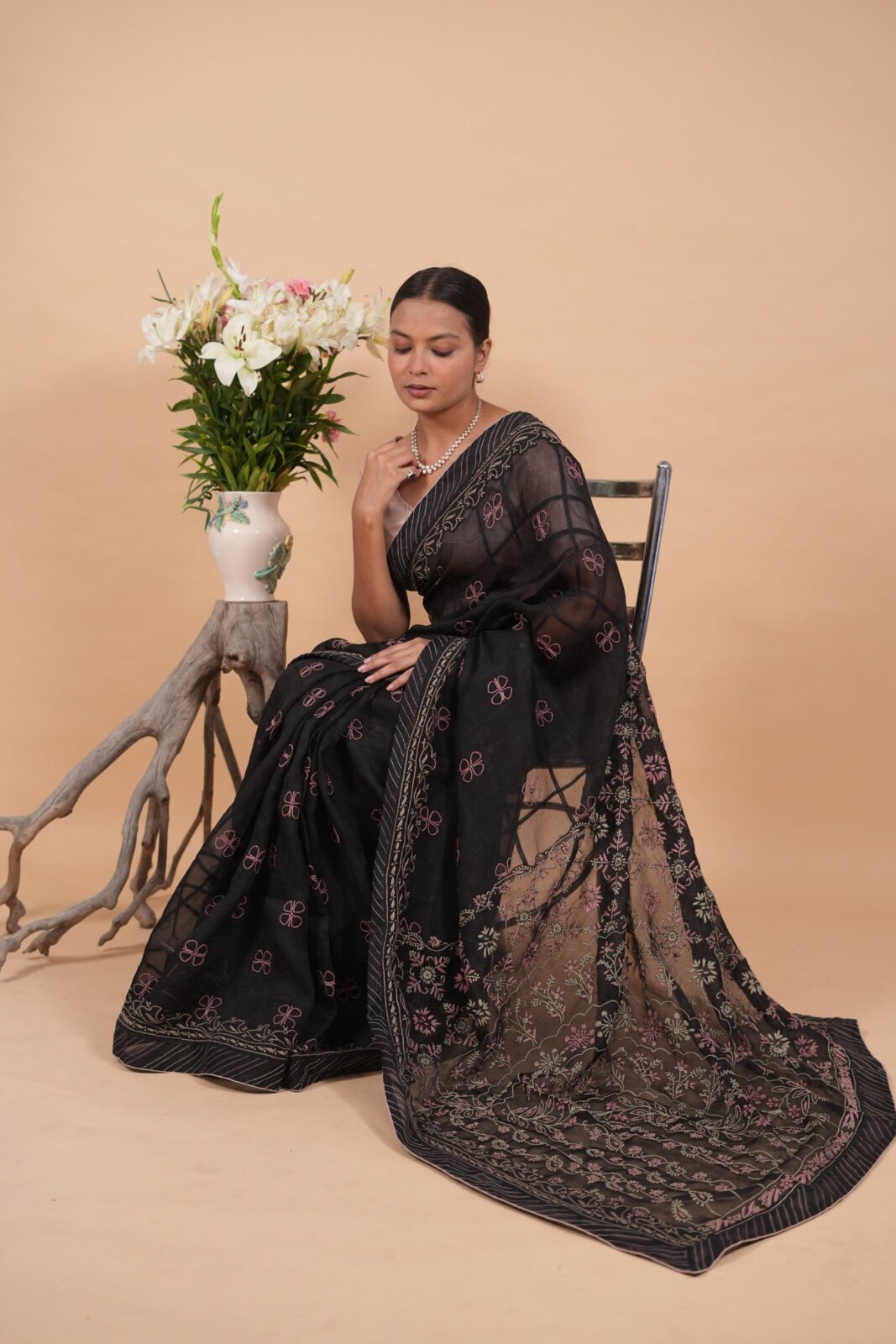 Black silk organza saree with border pallu, embroidered with contrasting pink and beige ghaspatti embroidery. The saree comes with a 1 metre blouse and lining.