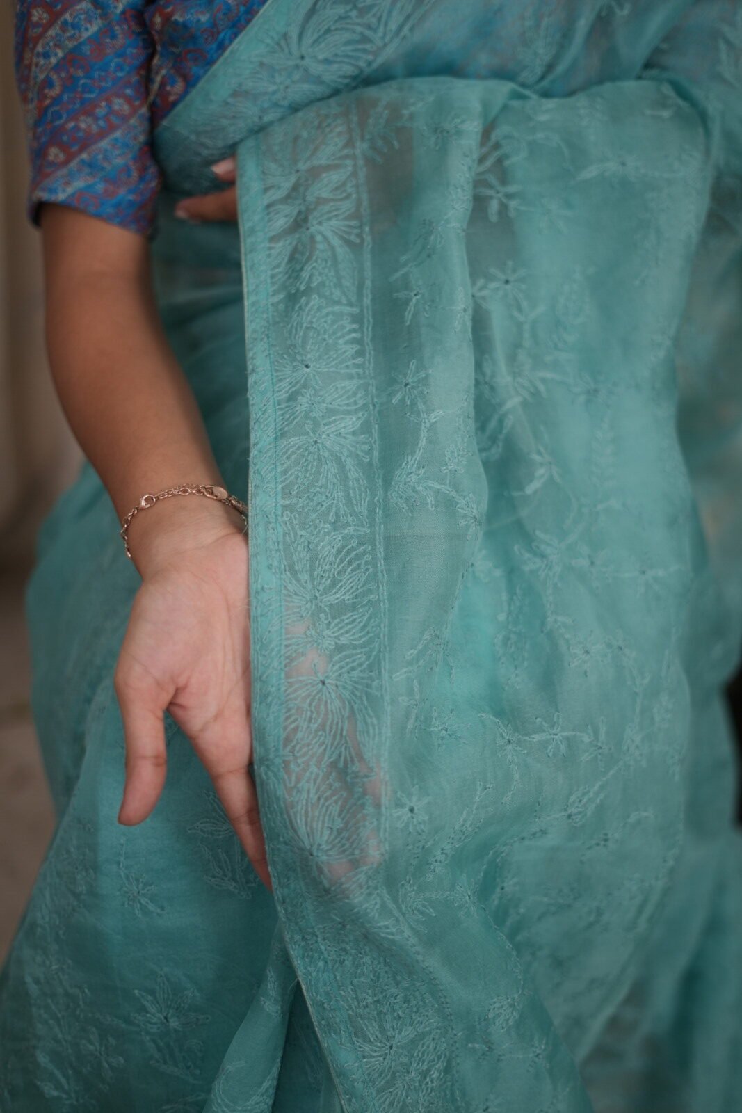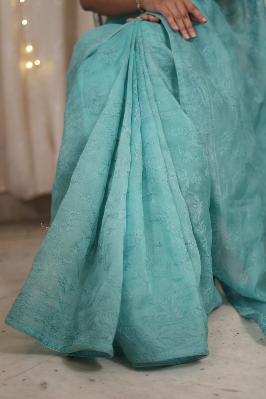 Turqouise silk organza saree with light tapechi embroidery. It is embroidered all over with light tapechi. It is finished with a turqoise piping. The saree comes with a 1 metere blouse and lining.